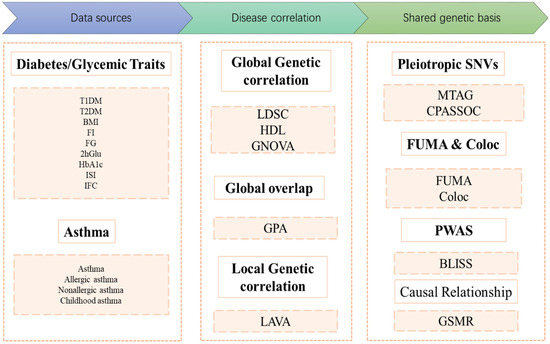 GWASs minimize reverse causation, lifestyle factors, or environmental confounders. Investigating shared genetic mechanisms across multiple diseases through GWAS summary data is a key genetic research method [13,14,15]. Integrating GWAS data with genetic correlation analysis, pleiotropic variant identification, and cross-trait analysis enables detailed exploration of common genetic foundations across diseases, revealing shared pathogenic genes/pathways and novel insights into complex disease mechanisms, Therefore, this study leverages GWAS data to investigate the shared genetic architecture, causal relationships, and potential functional pathways among DM, glycemic traits and asthma subtypes through genome-wide pleiotropic association analyses.