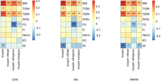 Genetic correlation analysis between asthma phenotypes and diabetes/glycemic traits. *: FDR < 0.05, **: FDR < 0.01.