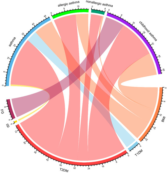 Chord diagram representing the network of local genetic correlations between diabetes and glucose metabolism traits with asthma. A greater width of a ribbon reflects a greater number of loci that are genetically correlated between two phenotypes, highlighting substantial polygenic overlap and suggesting potential pathophysiological mechanisms shared between them. BMI: Body Mass Index, FG: Fasting Glucose, ISI: Insulin Sensitivity Index, T2DM: Type 2 Diabetes Mellitus, T1DM: Type 1 Diabetes Mellitus.