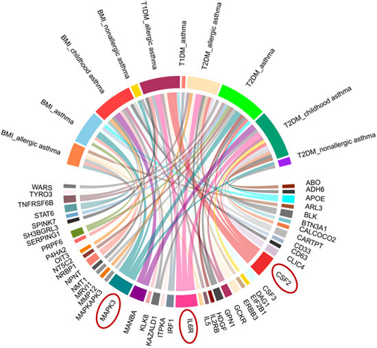 Chord diagram of proteins associated with glucose metabolism traits and asthma comorbidity identified by BLISS. Red circles highlight key proteins (MAPK3, IL6R, CSF2) with prominent associations.
