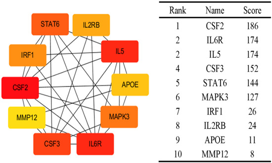 Top 10 proteins associated with both glucose metabolism traits and asthma identified by Cytohubba. The colors intensity represents the strength of the MCC correlation between the proteins.