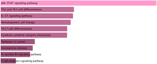Using the BLISS method, we identified 46 proteins associated with comorbid risks of glucose metabolism traits and asthma. Among these proteins, MAPK3, IL6R, and CSF2—the most widely shared proteins—emerged as potential key regulators influencing the comorbidity of glucose metabolism dysregulation and asthma (Supplementary Table S5, Figure 4). Protein‒protein interaction (PPI) networks for the identified shared proteins were constructed via the STRING database. The CytoHubba plugin on the Cytoscape (version 3.10.1) platform, which employs the maximal clique centrality (MCC) algorithm, was used to screen the top 10 hub proteins on the basis of network topology weights. These core hub proteins included CSF2, IL6R, IL5, CSF3, STAT6, MAPK3, IRF1, IL2RB, APOE, and MMP12 (Figure 5). The 10 hub proteins were subsequently uploaded to the Enrichr web tool (https://maayanlab.cloud/Enrichr/) [31] for KEGG pathway enrichment analysis, revealing their predominant involvement in the JAK-STAT signaling pathway, Th1 and Th2 cell differentiation, and the IL-17 signaling pathway (Figure 6). Further tissue enrichment analysis via FUMA demonstrated that these proteins were predominantly enriched in lung, blood, and muscle tissues (Figure 7).