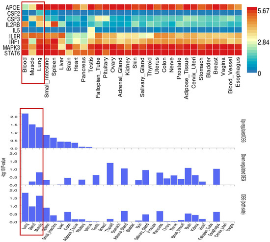 Tissue-specific expression of 10 core proteins related to glucose metabolism traits and asthma in 30 general tissue types. Red boxes highlight three key tissues (Blood, Skeletal Muscle, Lung) and their corresponding profiles of core protein expression levels and statistical significance, which are closely associated with the comorbidity of glucose metabolism traits and asthma.