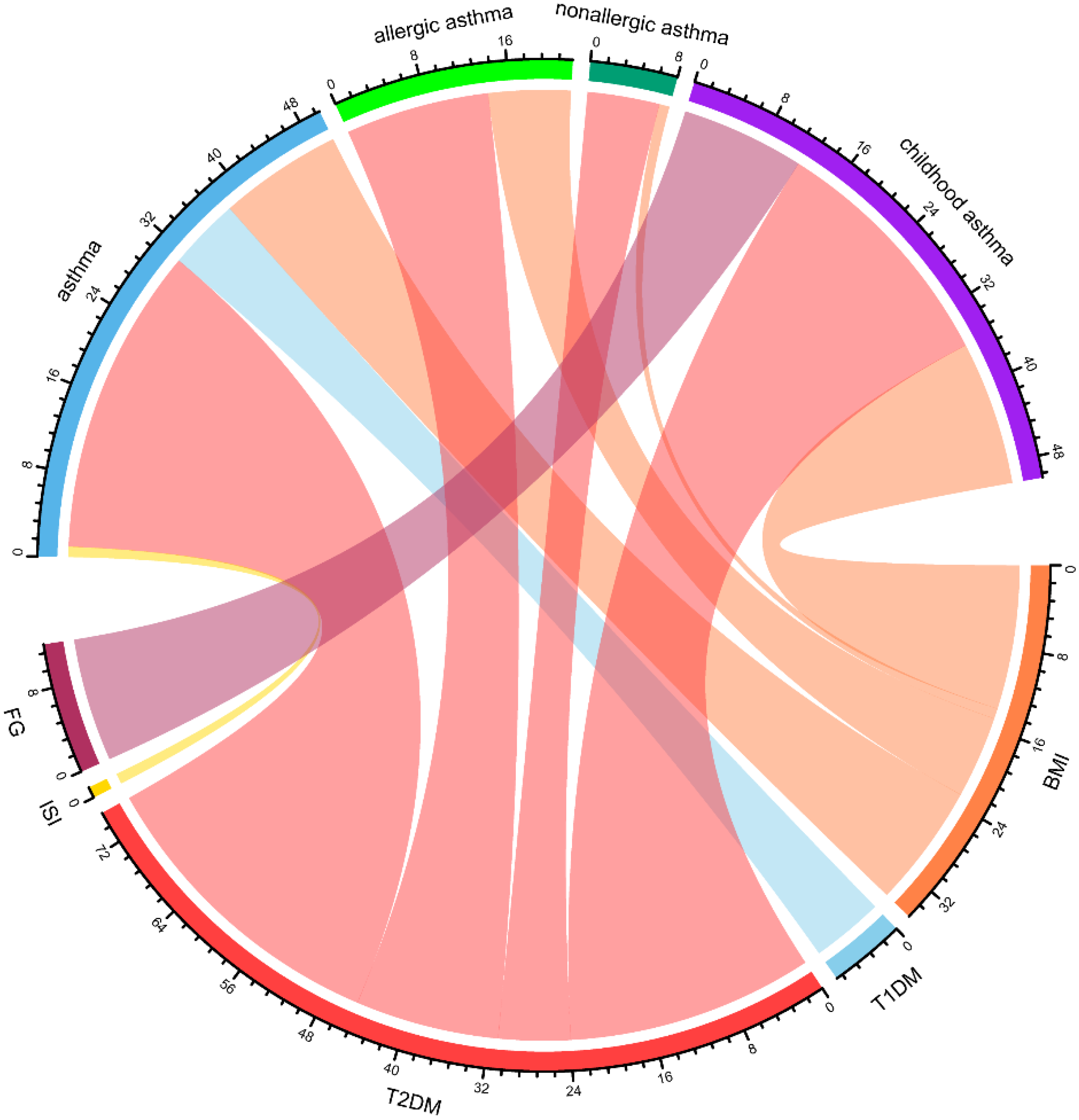 - Obesity (BMI) and type 2 diabetes mellitus (T2DM) show significant genetic correlations and causal effects on asthma risk.