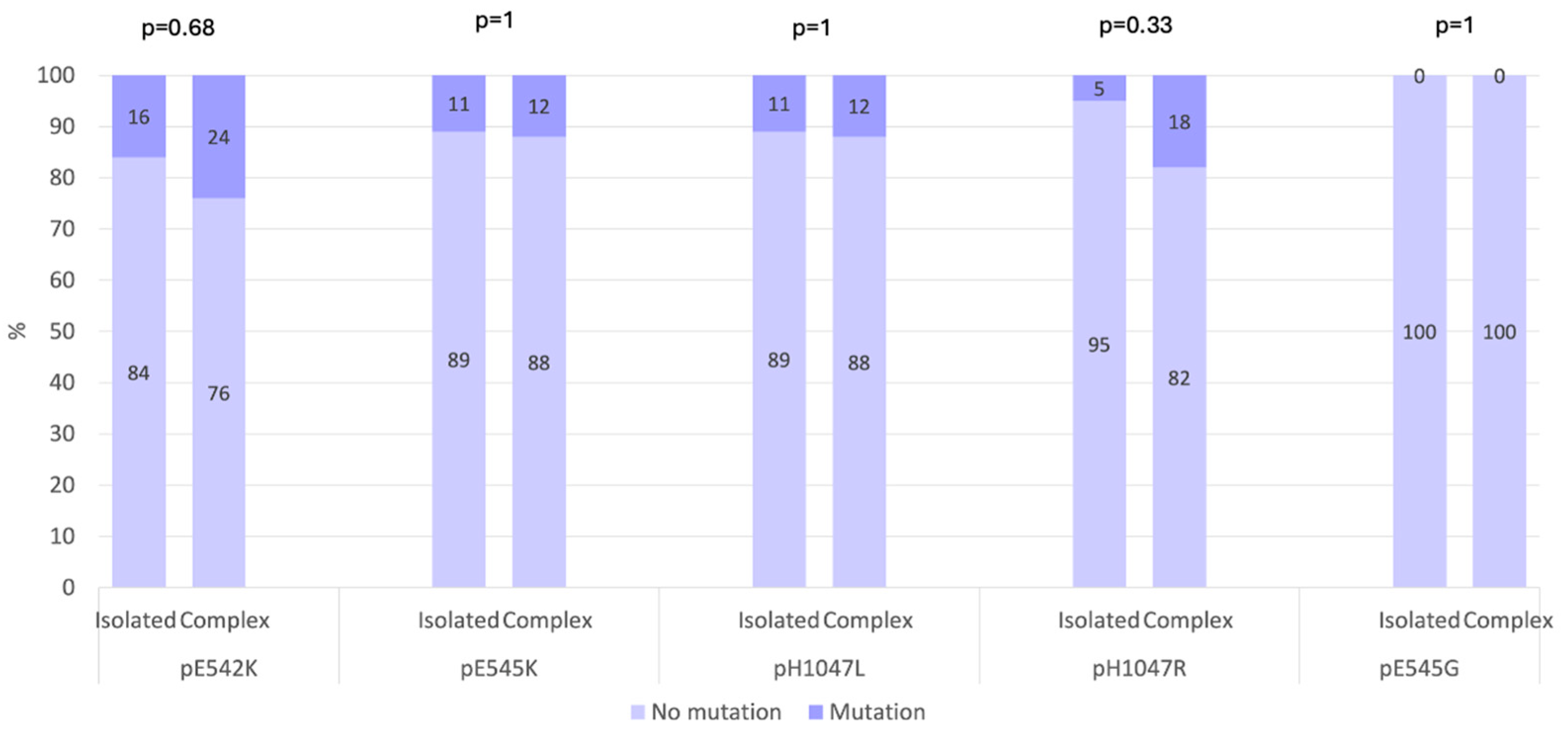 Figure 2. Prevalence of gene mutations in hotspots across isolated and complex LMs (p-value Fisher’s exact test).