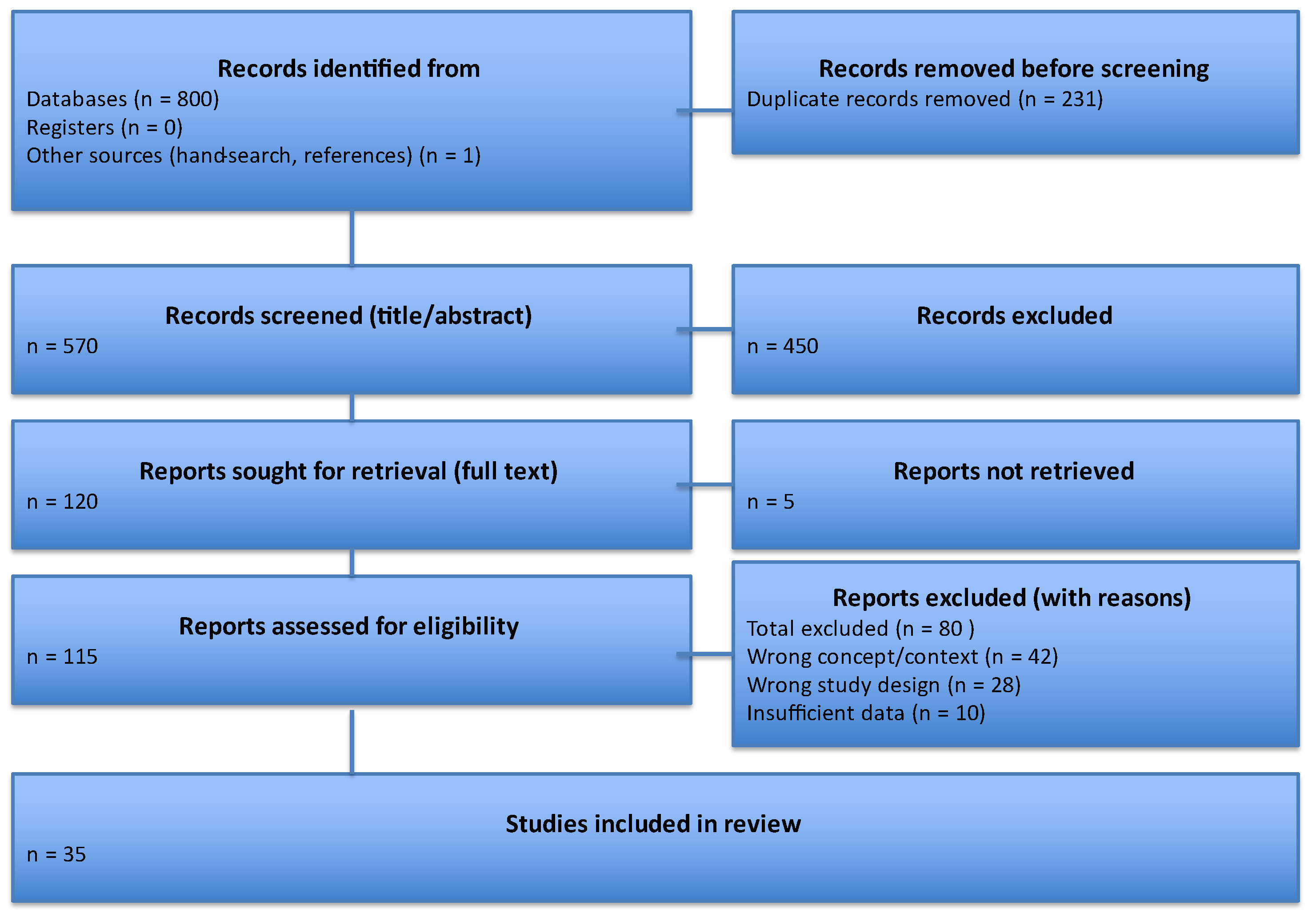 Following exclusion of 450 irrelevant records, 115 full texts were assessed for eligibility; 35 studies met the inclusion criteria and were incorporated into the final synthesis. Reasons for exclusion were as follows: wrong concept or context (n = 42), ineligible study design (n = 28), and insufficient data (n = 10). The entire process is summarized in Figure 1 (PRISMA flow diagram).