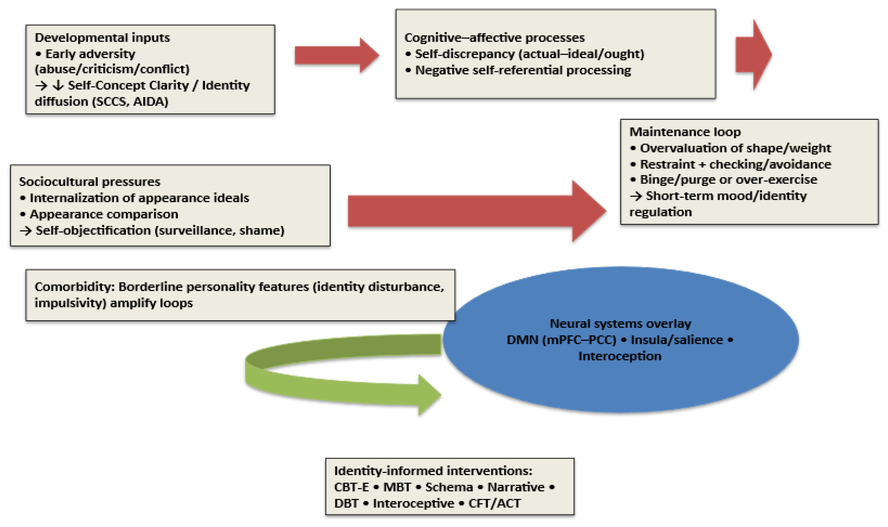 Bringing these frameworks together, Figure 2 presents an identity-centered model linking early adversity, identity disruption, sociocultural pressures, and neurocognitive systems to ED maintenance and recovery pathways. The figure integrates developmental, sociocultural, cognitive-affective, and neurobiological levels to depict how identity disturbance sustains ED pathology. Early adversity undermines self-concept clarity and identity integration, increasing susceptibility to internalization of appearance ideals and appearance-based social comparison, which foster self-objectification. These pressures converge on a cognitive-affective hub characterized by self-discrepancies (actual-ideal/ought) and negative self-referential processing. A neural overlay highlights alterations in default-mode (medial prefrontal–posterior cingulate) and interoceptive/salience (insula) networks that likely scaffold these self-processes. On this substrate, a maintenance loop emerges: overvaluation of shape/weight promotes dietary restraint and body checking/avoidance, which precipitate binge/purge or over-exercise; these behaviors provide short-term mood/identity regulation and feed back to strengthen overvaluation and identity diffusion. Comorbid borderline-personality features (notably identity disturbance and impulsivity) can amplify the loop. The model also indicates leverage points for recovery: CBT-E for overvaluation/behaviors, Mentalization-Based Therapy (MBT) for self-mentalizing, schema and narrative approaches for self-structure and re-authoring, Dialectical Behavior Therapy (DBT)-informed skills for affect/impulse regulation, interoceptive work for body mistrust, and compassion/values-based methods to broaden non-appearance self-worth.