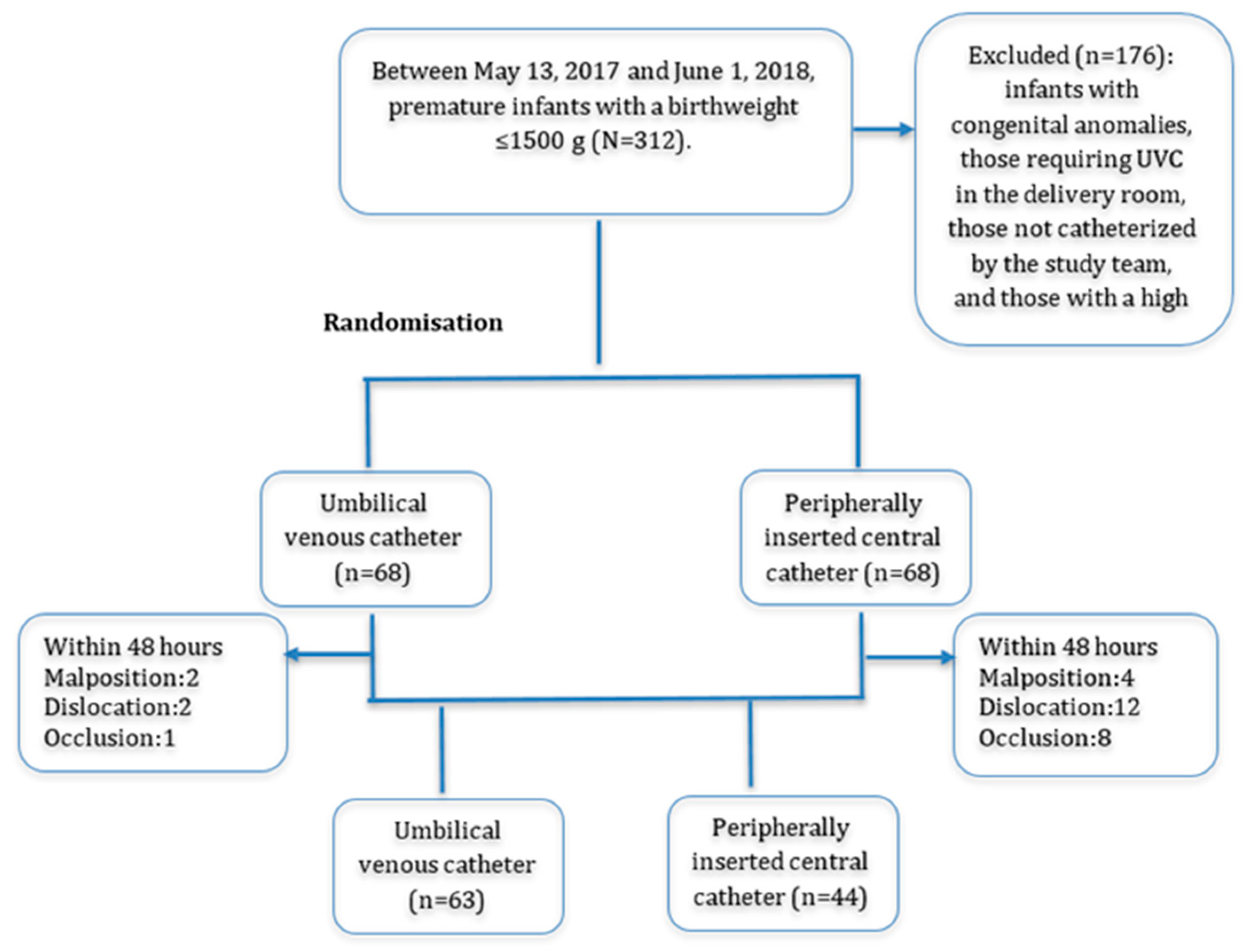 - Dongara, A.R.; Patel, D.V.; Nimbalkar, S.M.; Potana, N.; Nimbalkar, A.S. Umbilical venous catheter versus peripherally inserted central catheter in neonates: A randomized controlled trial. J. Trop. Pediatr. 2017, 63, 374–379. [Google Scholar] [CrossRef]