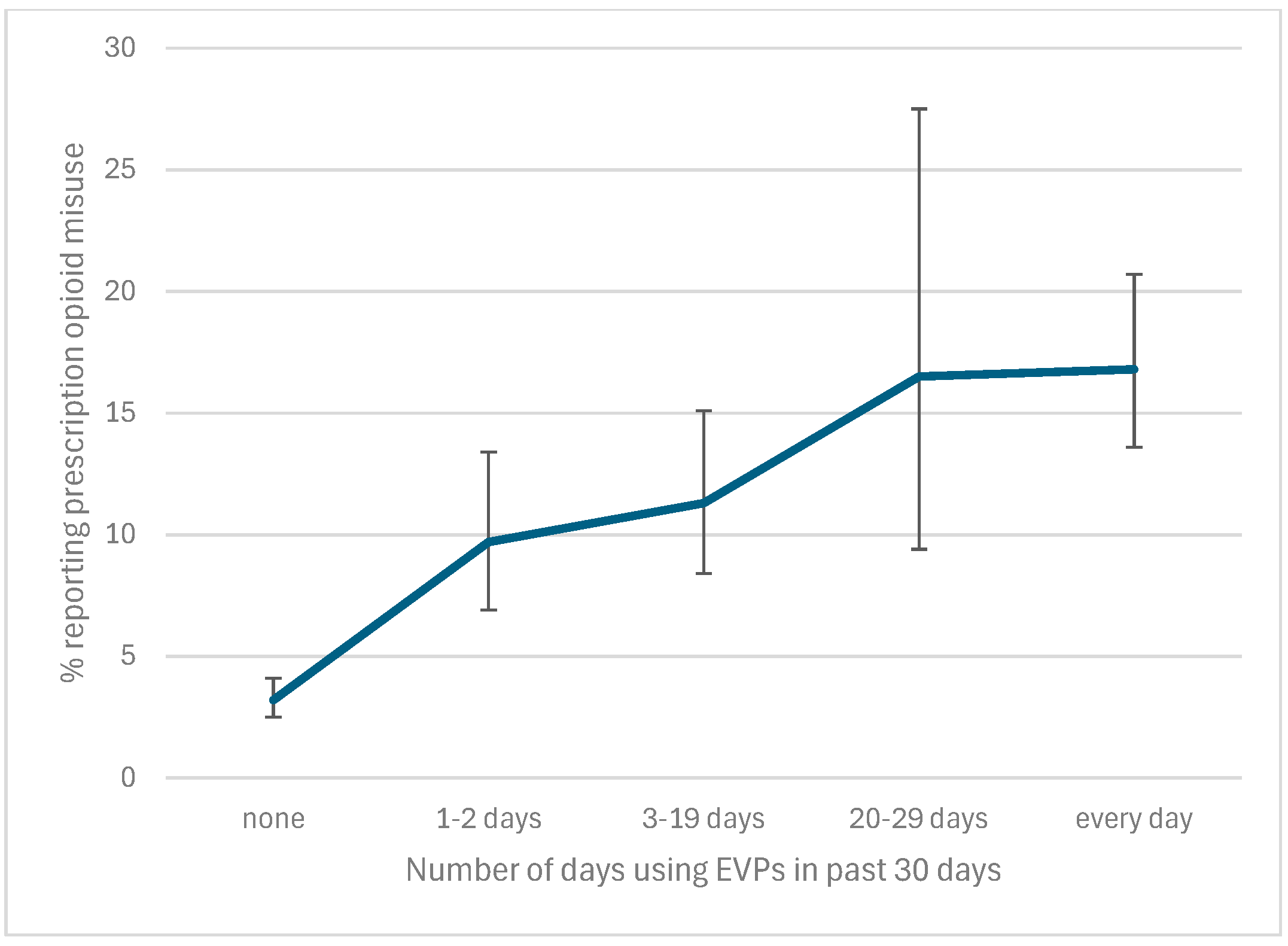 - This relationship had a dose-dependent effect, with an increased frequency of EVP use correlating with an increased prevalence of current opioid misuse