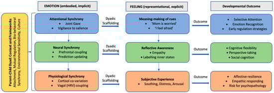 The aim of this review is to provide a developmental framework that distinguishes emotion as an embodied, evolutionarily conserved process and feeling as its consciously experienced correlate, while situating both within parent–child dyads. Evidence is synthesized across multiple modalities: (a) attentional synchrony captured via eye-tracking, (b) neural synchrony examined with hyperscanning methods, and (c) hormonal synchrony assessed through cortisol coupling. By integrating these domains, the review positions emotional development not as an isolated individual process but as an emergent property of dynamic, multilevel caregiver–child interactions. Finally, the review emphasizes the importance of cultural and contextual influences. Cross-cultural research indicates that parental beliefs, caregiving practices, and sociocultural scripts shape how emotions are expressed and scaffolded into feelings []. Interventions designed to foster emotional attunement therefore require attention to both individual neurobiological sensitivity and broader sociocultural contexts. Through this synthesis, the review contributes theoretical clarity and outlines future directions for research on resilience, dysregulation, and clinical intervention.