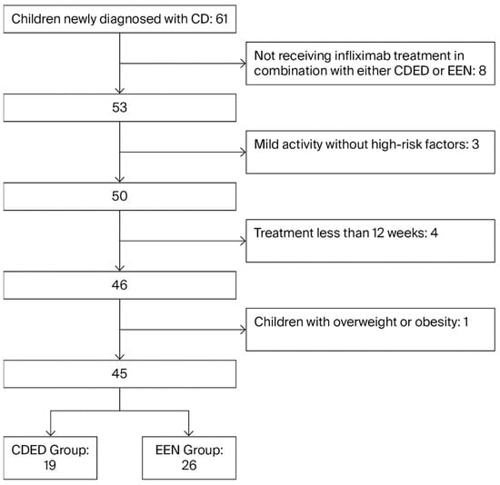 Children were divided into the EEN group and the CDED therapy group based on their nutritional therapy regimens. The participant selection process was detailed in Figure 1.