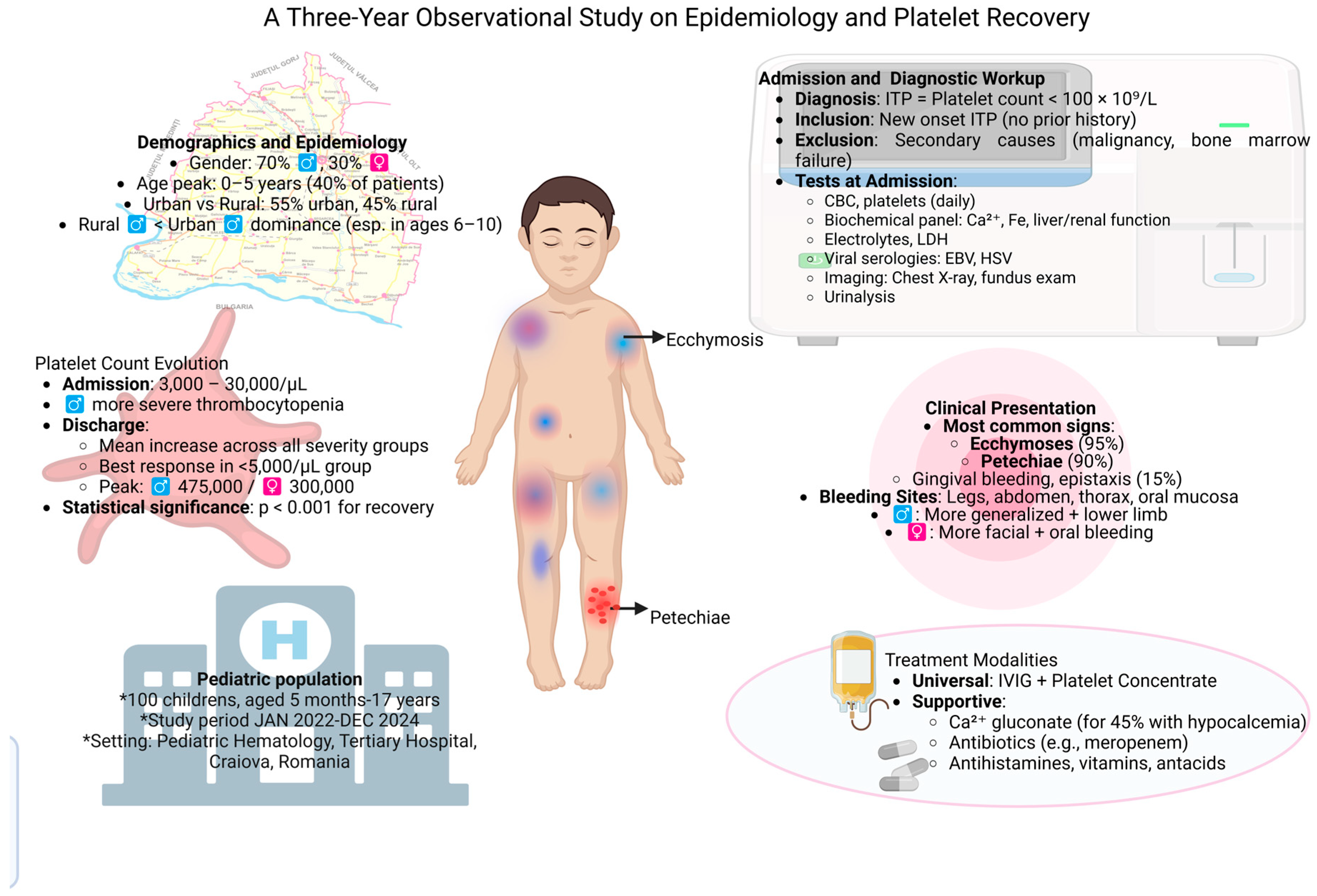 Singer, C.E.; Andreea Gabriela, M.; Carmen, S.; Enescu, A.; Gaman, S.; Varut, R.M.; Dalia, D.; Veronica, M.E.; Vintilescu, Ș.B.; Ionovici, N.; et al. Platelet Recovery and Coexisting Conditions in Pediatric Immune Thrombocytopenia: Insights from a Tertiary Care Study. Children 2025, 12, 1482. https://doi.org/10.3390/children12111482