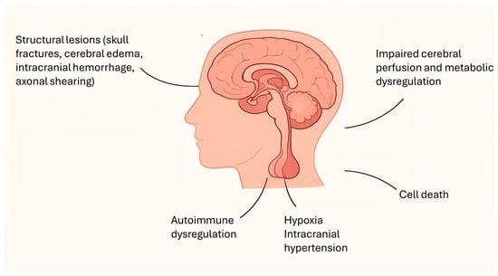 Traumatic brain injury (TBI) in childhood represents a significant global health issue and continues to rank among the leading causes of morbidity and mortality within the pediatric population [,,]. Its incidence has been steadily rising, with annual estimates ranging between 180 and 250 cases per 100,000 children. Two age groups appear particularly vulnerable: early childhood, where falls represent the predominant etiology, and adolescence, when sports-related trauma, bicycle accidents, road traffic incidents, and risk-taking behaviors constitute the main contributors [,,]. Each year, approximately 29,000 children aged 0–14 years require hospitalization for TBI, of whom nearly 10% sustain moderate to severe injuries. Despite this considerable burden, the acute and chronic pathophysiological processes underlying pediatric TBI—and the spectrum of long-term consequences—remain incompletely understood [,,,,,]. Among these sequelae, post-traumatic endocrine dysfunction has emerged as a clinically relevant yet frequently underrecognized complication. Beyond the immediate structural and functional cerebral damage, TBI can trigger substantial neuroendocrine alterations, often manifesting days to months after the initial insult [,,]. The pathophysiology of TBI is complex and multifactorial, encompassing not only the primary mechanical injury but also a cascade of secondary processes, including systemic hypotension, hypoxia, intracranial hypertension, and disturbances in cerebral perfusion and metabolism, as reported in Figure 1 [,]. Structural lesions such as skull fractures, cerebral edema, and intracranial hemorrhage further exacerbate intracranial pressure and can contribute to hypothalamic–pituitary axis (HPA) injuries, in addition to direct axonal shearing []. The primary injury is characterized by impaired cerebral perfusion, metabolic dysregulation, and ionic imbalance, ultimately leading to edema and cell death. Secondary injury, evolving over hours to weeks, aggravates this damage through vascular compromise and widespread central nervous system (CNS) swelling, with potentially fatal outcomes such as brainstem herniation []. In addition to these mechanical and vascular mechanisms, growing evidence suggests an autoimmune component in the pathogenesis of post-traumatic hypopituitarism. Tanriverdi et al. demonstrated that anti-pituitary antibodies can persist for up to three years in patients with TBI-induced pituitary dysfunction, thereby supporting the hypothesis that immune-mediated mechanisms may significantly contribute to chronic pituitary impairment [,].