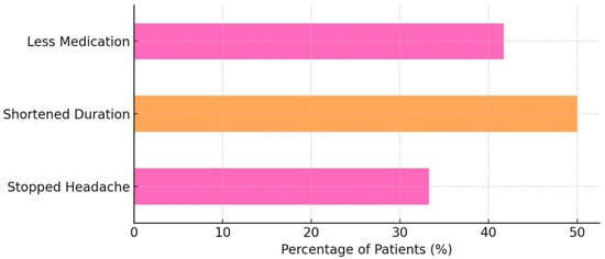 As the primary outcomes, a large proportion of patients reported meaningful headache benefits with REN, including complete cessation in one-third and shortened durations in about one-half of participants. These findings also align with clinical trial data showing 58.9–74.2% pain relief and 20.0–35.6% pain freedom at 2 h [], as well as adolescent trial findings of 71% pain relief and 35% pain freedom []. Importantly, 41.7% of patients required less acute medication after using Nerivio, supporting the potential of REN as a medication-sparing strategy [,]. This is particularly relevant in pediatric populations, where medication overuse headache, tolerability issues, and caregiver concerns remain persistent challenges [,].