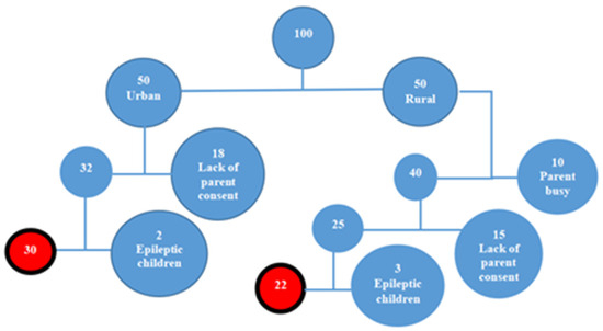 Due to logistical constraints and the high cost of analysis, consent was obtained for 32 children from the urban area and 25 from the rural area. However, three children from the rural area and two from the urban area were excluded due to a history of epilepsy, resulting in a final sample of 52 participants (30 from the urban area and 22 from the rural area) (Figure 1).