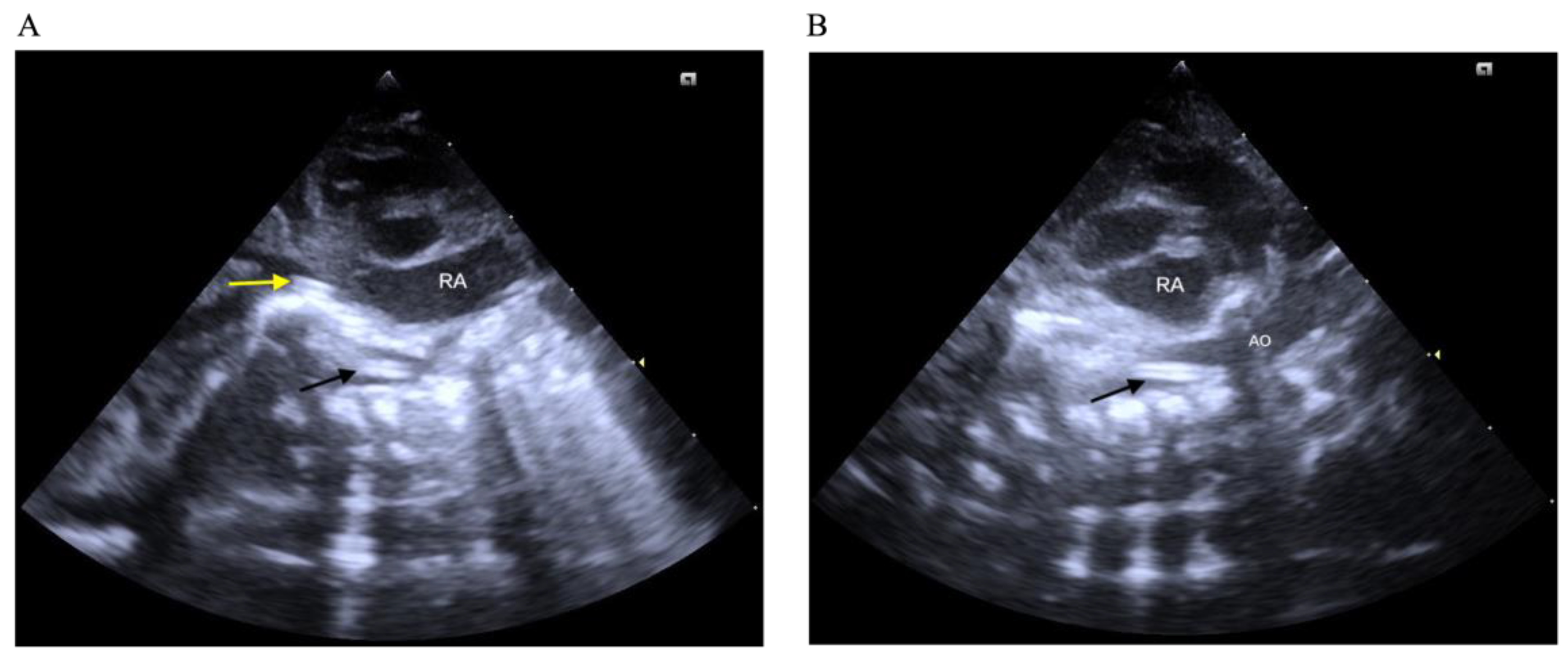 Figure 1. The proper positioning of the UAC and UVC: (A) the yellow arrow indicates that the UVC is at the junction of the inferior vena cava and right atrium and the black arrow shows that the UAC is within the thoracic aorta above the diaphragm (A,B). RA: right atrium; AO: aorta.