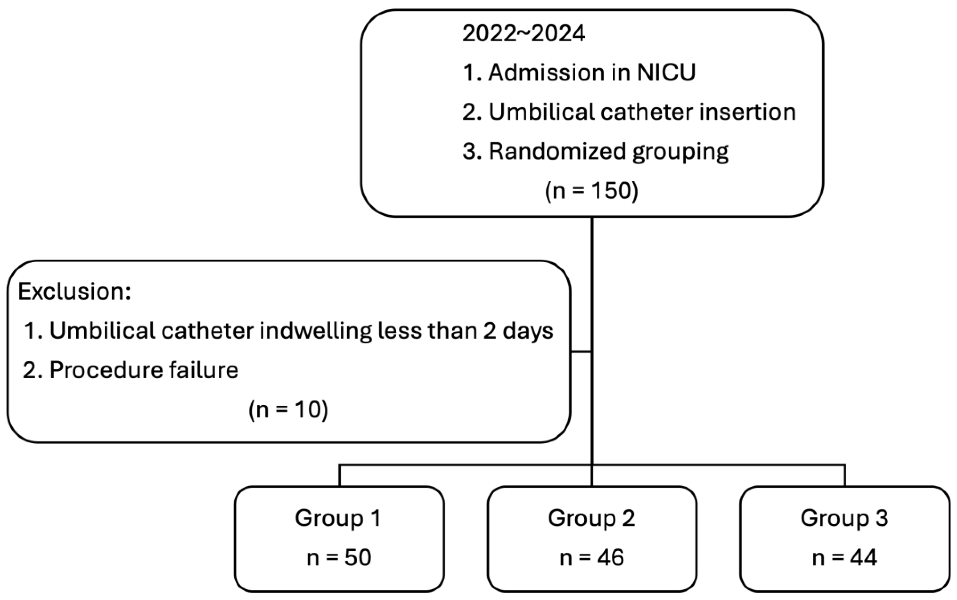 This prospective randomized controlled study was conducted from May 2022 to December 2024 and was approved by the Institutional Review Board of the Chang Gung Medical Foundation in Taoyuan, Taiwan, on 12 May 2022. The approval number was 202200365A3. Neonates were considered eligible for the study if they required UVC and UAC insertion as part of standard clinical care upon admission, contingent upon obtaining written informed consent from their parents. Neonates with significant umbilical cord anomalies, hydrops, or those who experienced unsuccessful umbilical catheter placements were excluded from the study. Finally, the enrolled participants were randomly assigned to groups using computer-generated random numbers.
