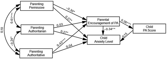 Path model describing the direct and indirect effects of parenting styles and parental PA encouragement on the child’s PA score and anxiety level (indices represent standardized estimates). * p ≤ 0.05, ** p ≤ 0.005, *** p ≤ 0.001.