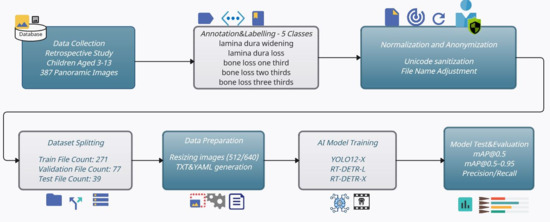 In this study, a total of 387 anonymized OPG (Orthopantomogram) images obtained from clinical panoramic X-rays (retrospectively collected from children aged 3 to 13) were first annotated in COCO format according to five bone anomaly classes. Following this, Unicode-based file name normalization and a stratified 70/20/10 train/validation/test split were performed. No repeated resampling or cross-validation was performed, as the study was designed to demonstrate model performance under a single reproducible split configuration. The implementation steps of the study are illustrated in
