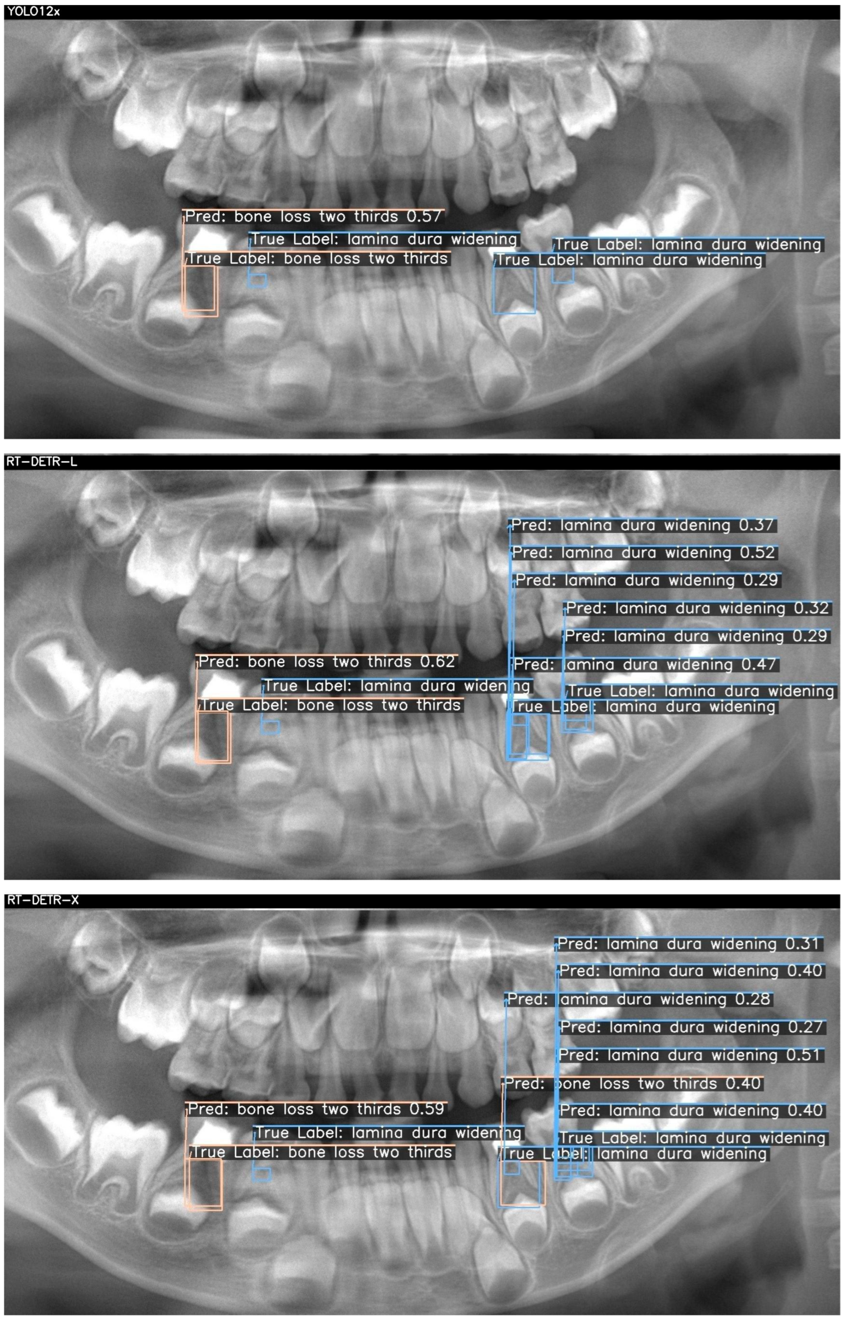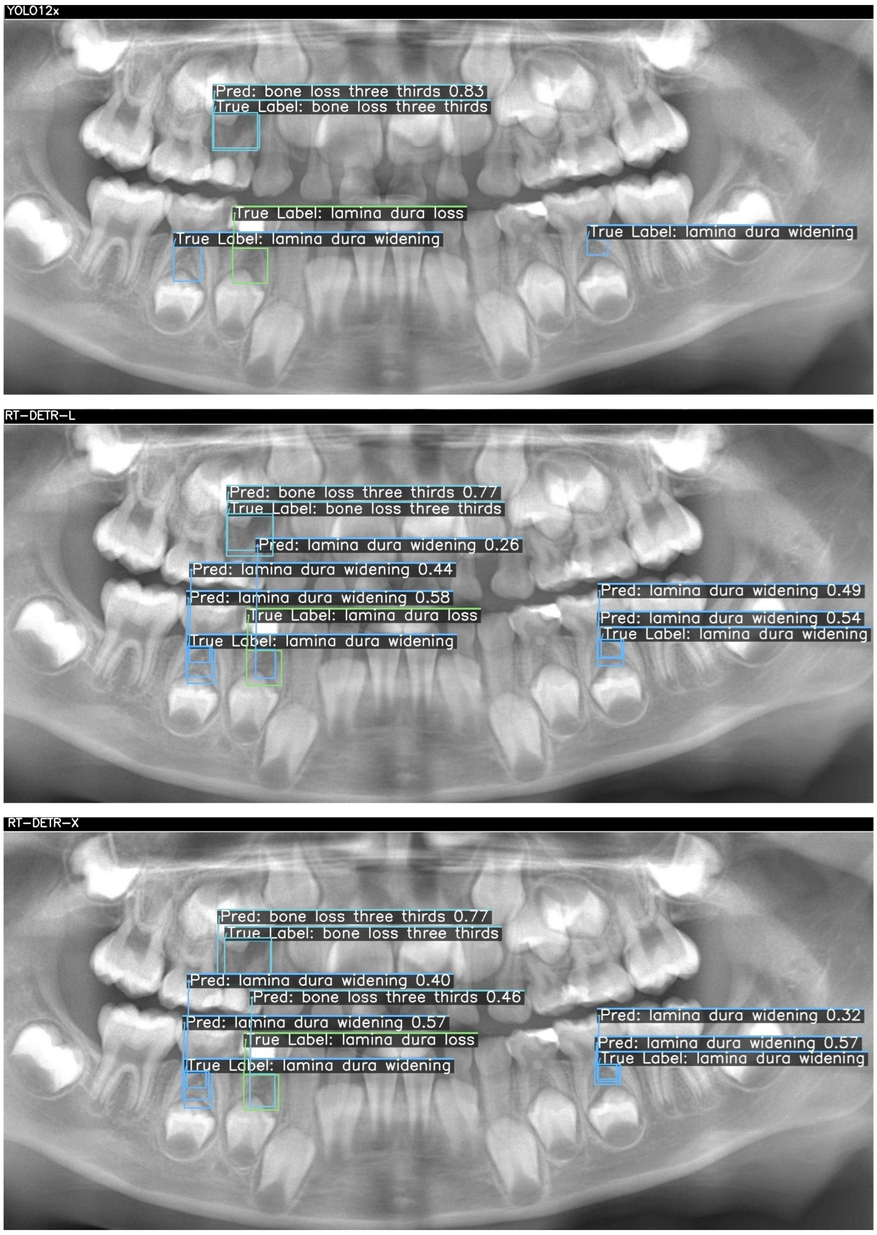 Figure 2, three ground-truth lesions were annotated on the panoramic radiograph: a central “bone loss three thirds” and two “lamina dura widening” regions in the lower molar areas. The YOLO12x model correctly detected only the central bone loss lesion (confidence = 0.83), but failed to identify either lamina dura widening (TP = 1, FN = 2, FP = 0). RT-DETR-L improved recall by capturing the bone loss (0.77) and one widening (0.44), yet introduced a spurious “lamina dura loss” prediction (TP = 2, FN = 1, FP = 1) and exhibited modest confidence scores (0.26–0.58). In contrast, RT-DETR-X achieved perfect coverage—detecting the bone loss (0.77) and both widenings (0.57, 0.32) without any false positives or negatives (TP = 3, FN = 0, FP = 0)—demonstrating superior balance between precision and recall in this challenging case as summarized in