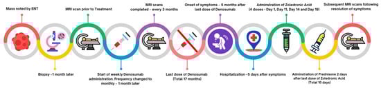 Remarkably, the lesion continued to shrink even after denosumab discontinuation. At the most recent follow-up MRI, performed 26 months after treatment discontinuation, the lesion measured 4.3 cm × 2.6 cm × 3.5 cm, (Figure 1D). Most importantly, the significantly deformed malformation on the left aspect of the mandible is clinically no longer apparent; the aneurysmal bone cyst is meanwhile just barely palpable, and the patient no longer complains of any pain. A timeline of the patient’s clinical course, from initial discovery to lesion regression and symptom resolution, is provided in Figure 2.