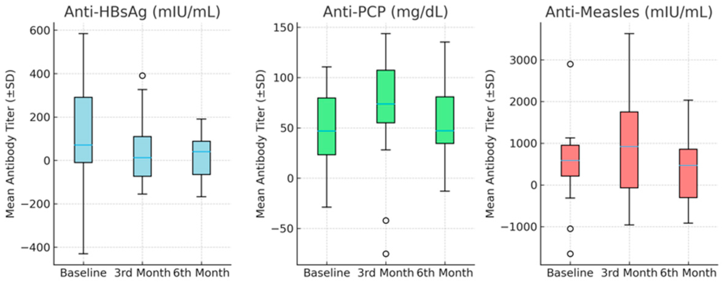 - During follow-up, a measurable decline in measles antibody levels was observed in a small number of patients, while protective titers for pneumococcus and hepatitis B were largely preserved.