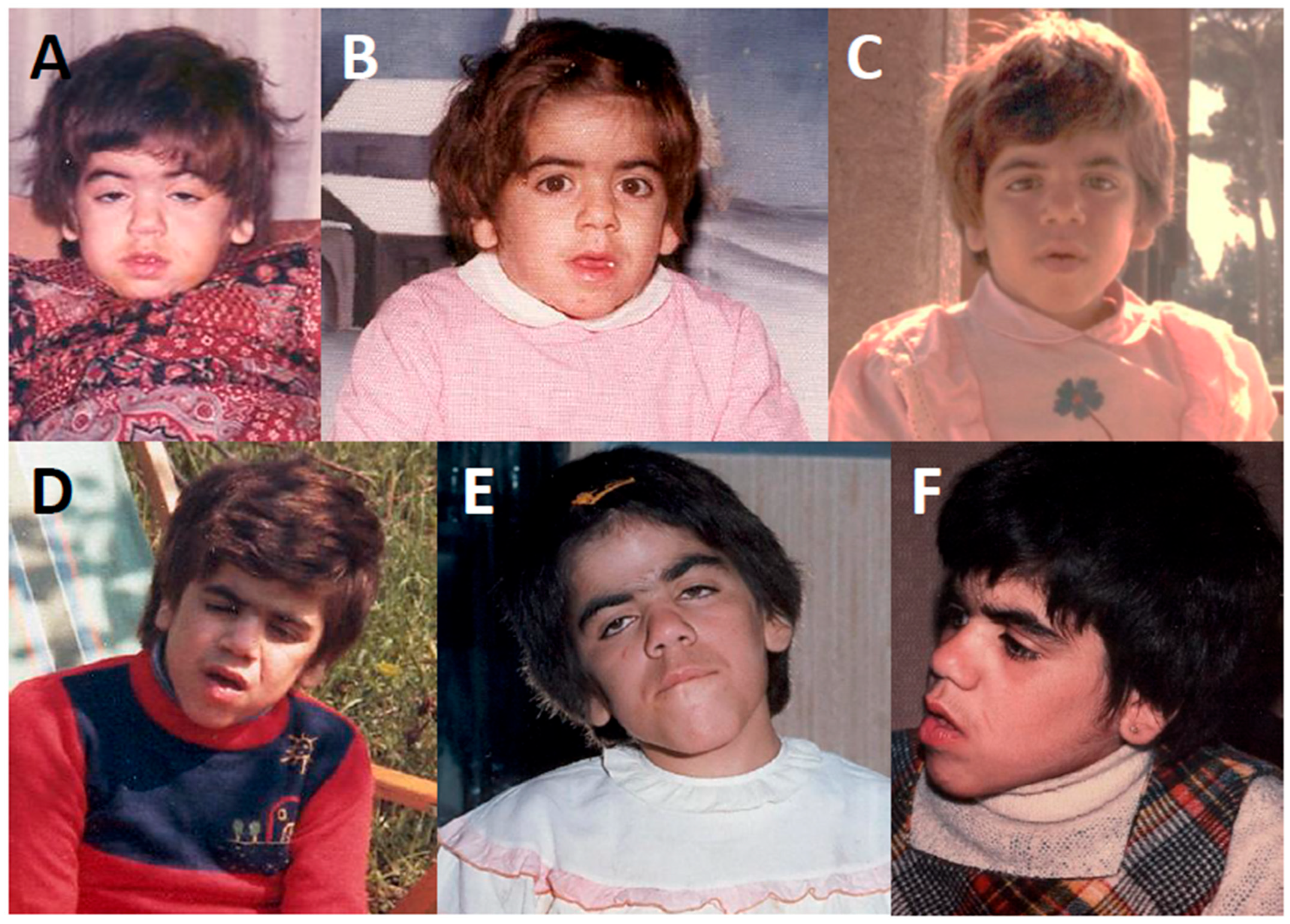 Figure 1. A female-child diagnosed with Sanfilippo syndrome in pictures shot at the age of 2 (A), 3 (B), 5 (C), 6 (D), 8 (E), and 10 years (F); her parents asked for many clinical consultations due to a mix of impoverished social interaction, severe abolition of sleep, epilepsy, and psychomotor regression starting at around 4 years. The diagnosis of mucopolysaccharidosis type III-A was established at 7 years via skin biopsy and specific enzyme activity measurement on peripheral blood leukocytes. Both parents of this child have given their written permission to publish the picture of their daughter.