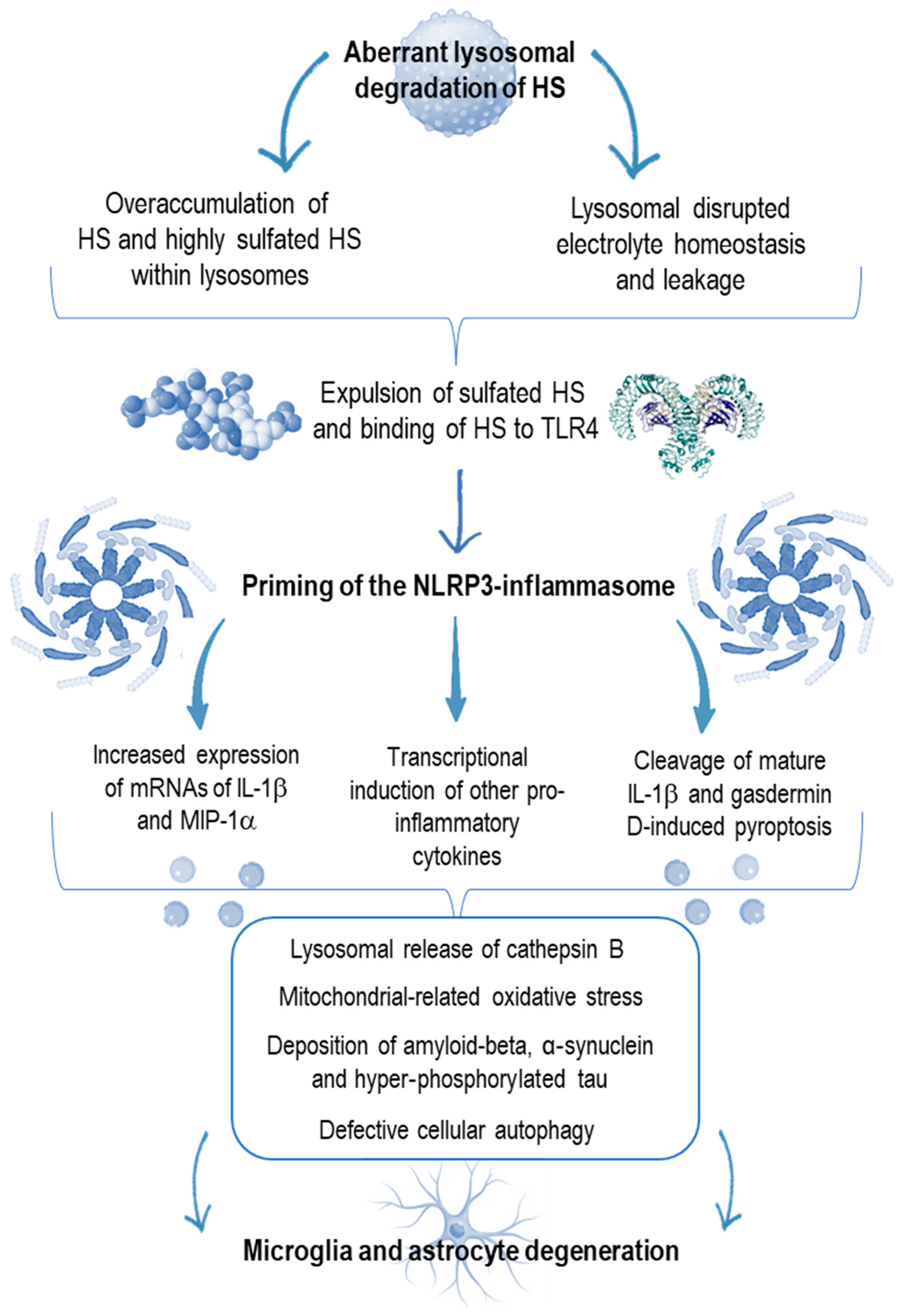 The mechanisms underlying the initiation and perpetuation of immune responses within the central nervous system of patients with MPS remain not fully explained and a potential innate immunity signature has yet to be exactly unraveled for the neuropathic forms of MPS. However, an expanding body of evidence suggests that neuroinflammation is a pathogenetic machinery of utmost importance in many neurological disorders, and that TLR4/IL-1 dependent priming with activation of the NLRP3-inflammasome assembly followed by IL-1β/IL-18 maturation and pyroptosis are determinant in eliciting both neurocognitive decline and behavioral abnormalities in the Sanfilippo syndrome [75]. The progressive accumulation of non-metabolized HS and production of highly sulfated HS fragments recognized as danger signals bring about a sequence of inflammatory cascades, initiated by TLR4 activation, characterized by the final oversecretion of pro-inflammatory cytokines within the central nervous system, resulting in microglia and astrocyte dysfunction. Targeting microglial pyroptosis may offer a potential strategy for neurodegenerative diseases, and immunomodulatory drugs like anakinra could become a promising tool in the management of neuropathic MPS as Sanfilippo syndrome with the aim of minimizing the unmet needs of these complex patients.