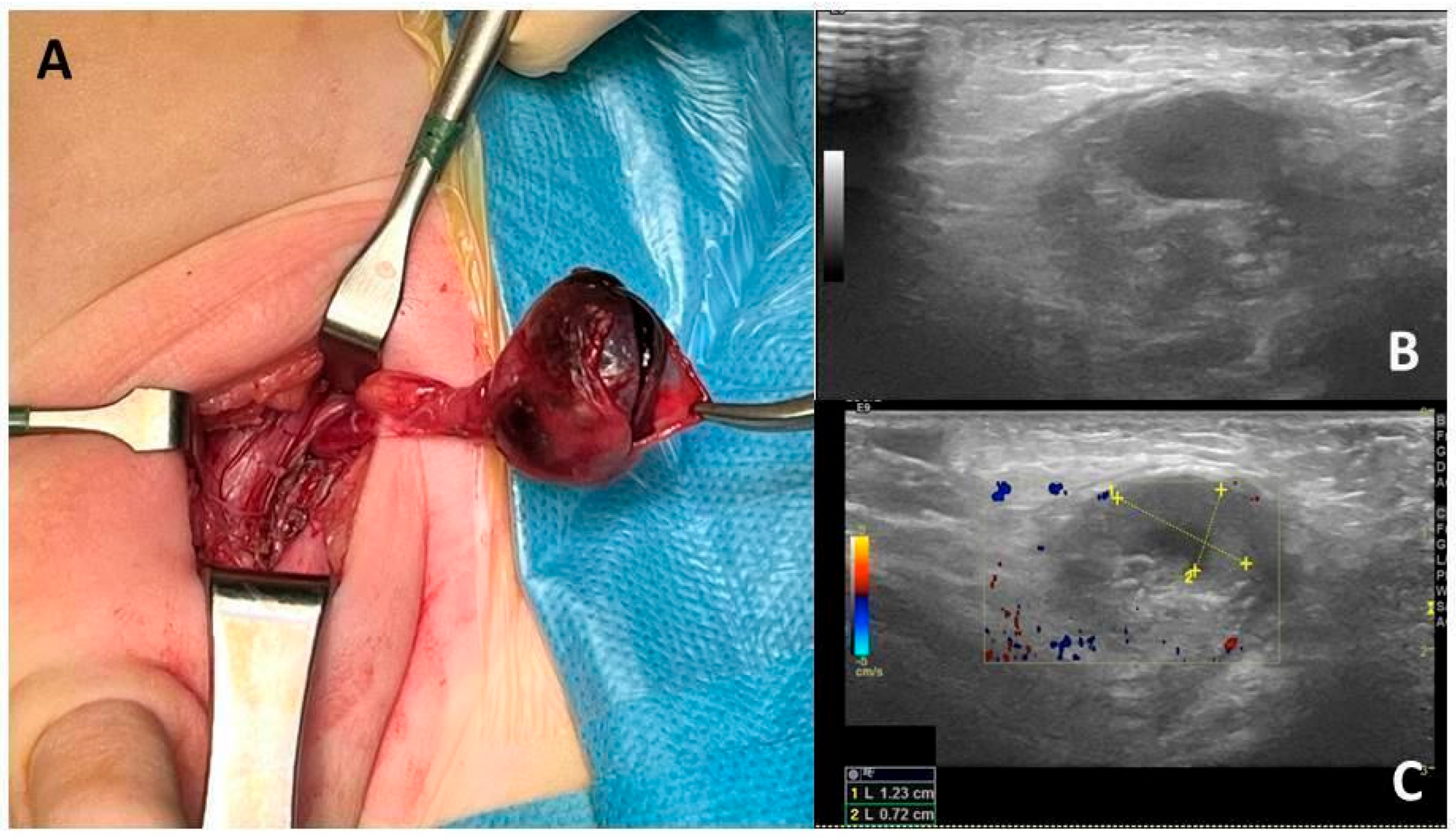 - Lio, K.; Nomura, O.; Kinumaki, A.; Aoki, Y.; Satoh, H.; Sakakibara, H.; Hataya, H. Testicular Torsion in an Infant with Undescended Testis. J. Pediatr. 2018, 197, 312–312.e1. [Google Scholar] [CrossRef]