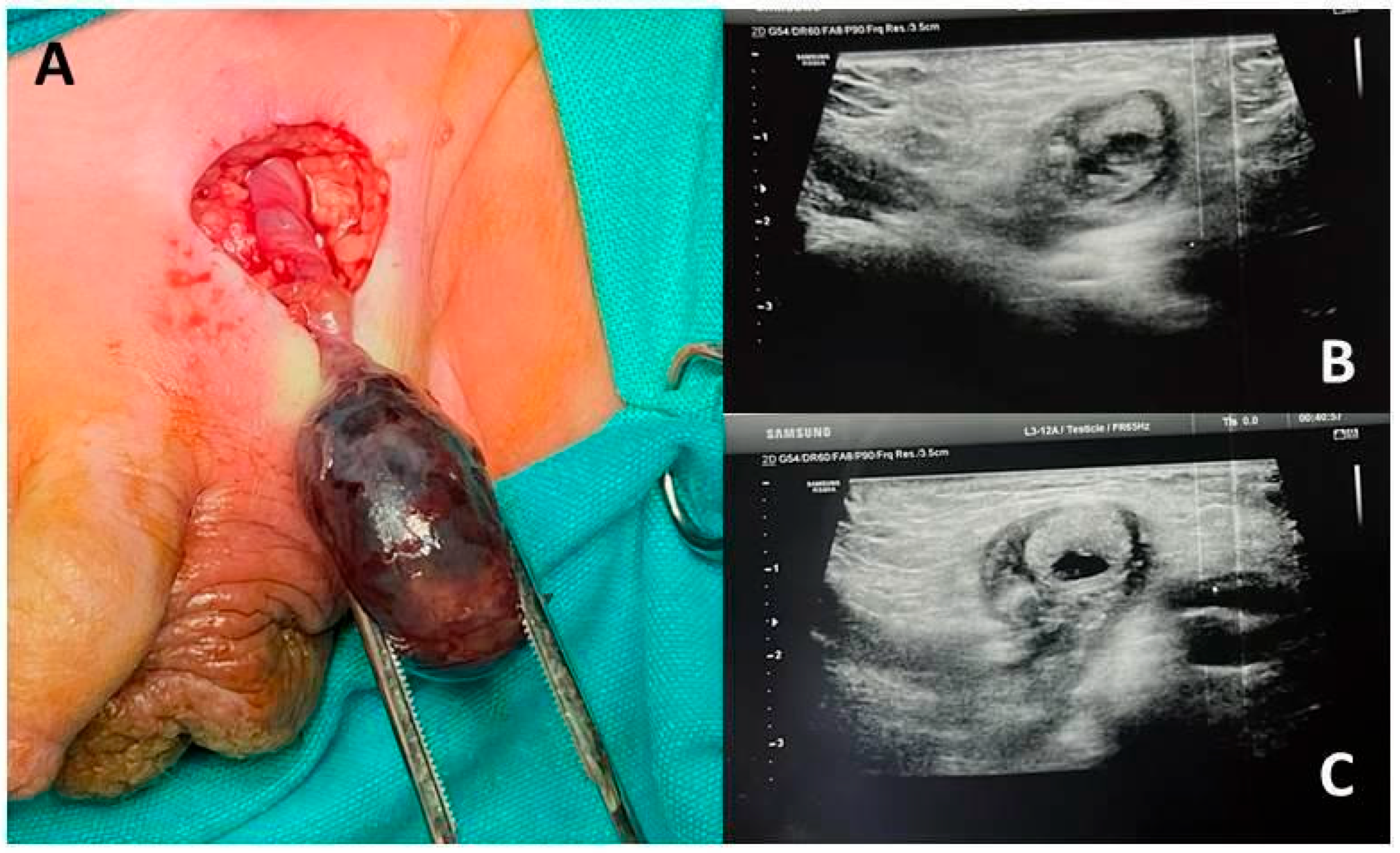 - Carvalho, F.F.; Talati, I.; Krill, A. Intravaginal torsion of undescended testes. BMJ Case Rep. 2019, 12, e231244. [Google Scholar] [CrossRef] [PubMed] [PubMed Central]