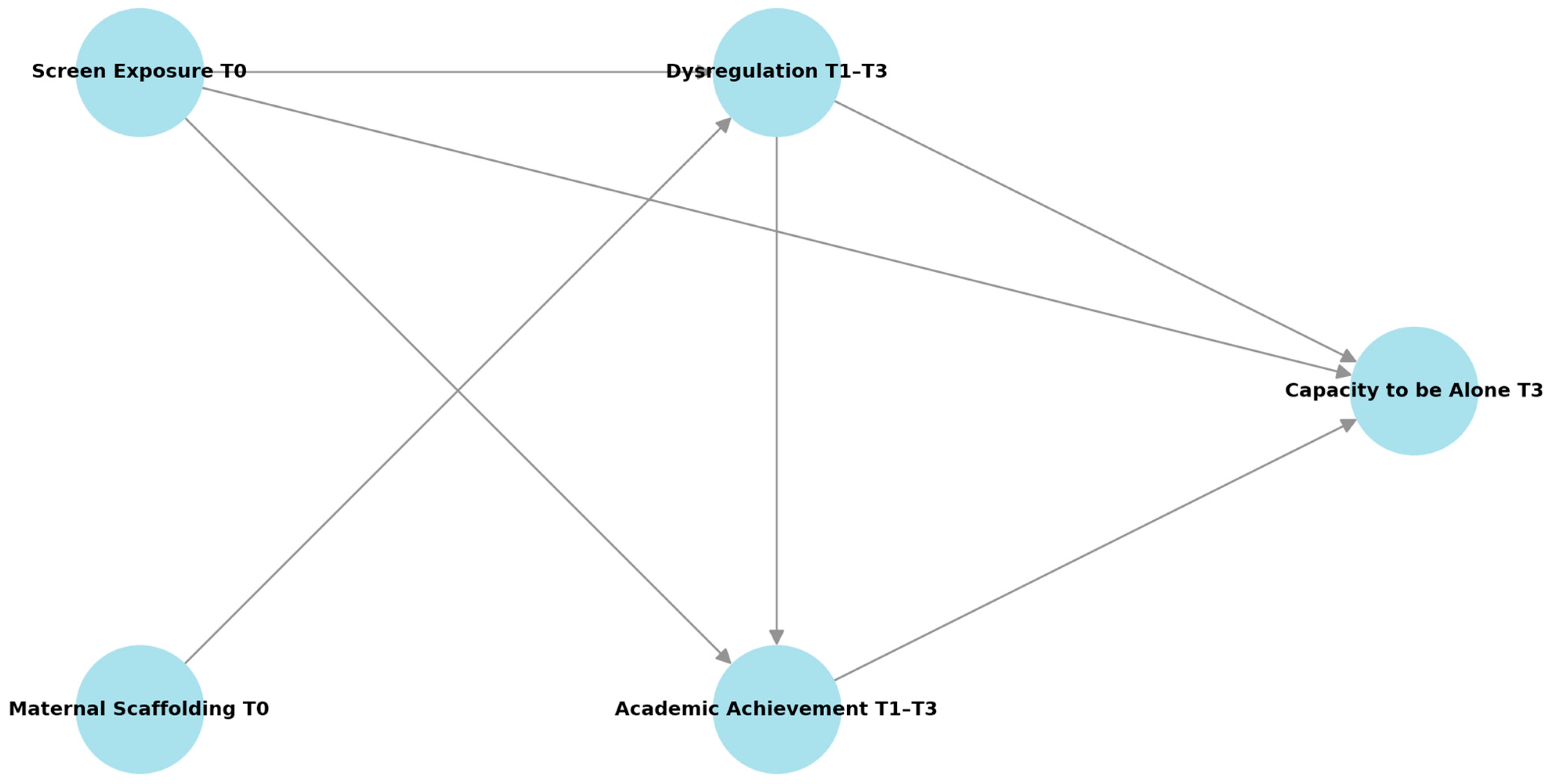 H3. Early screen exposure will negatively contribute to children’s capacity to be alone at age 12 (T3). This effect will occur both directly and indirectly, via the mediating role of dysregulation and academic achievement.