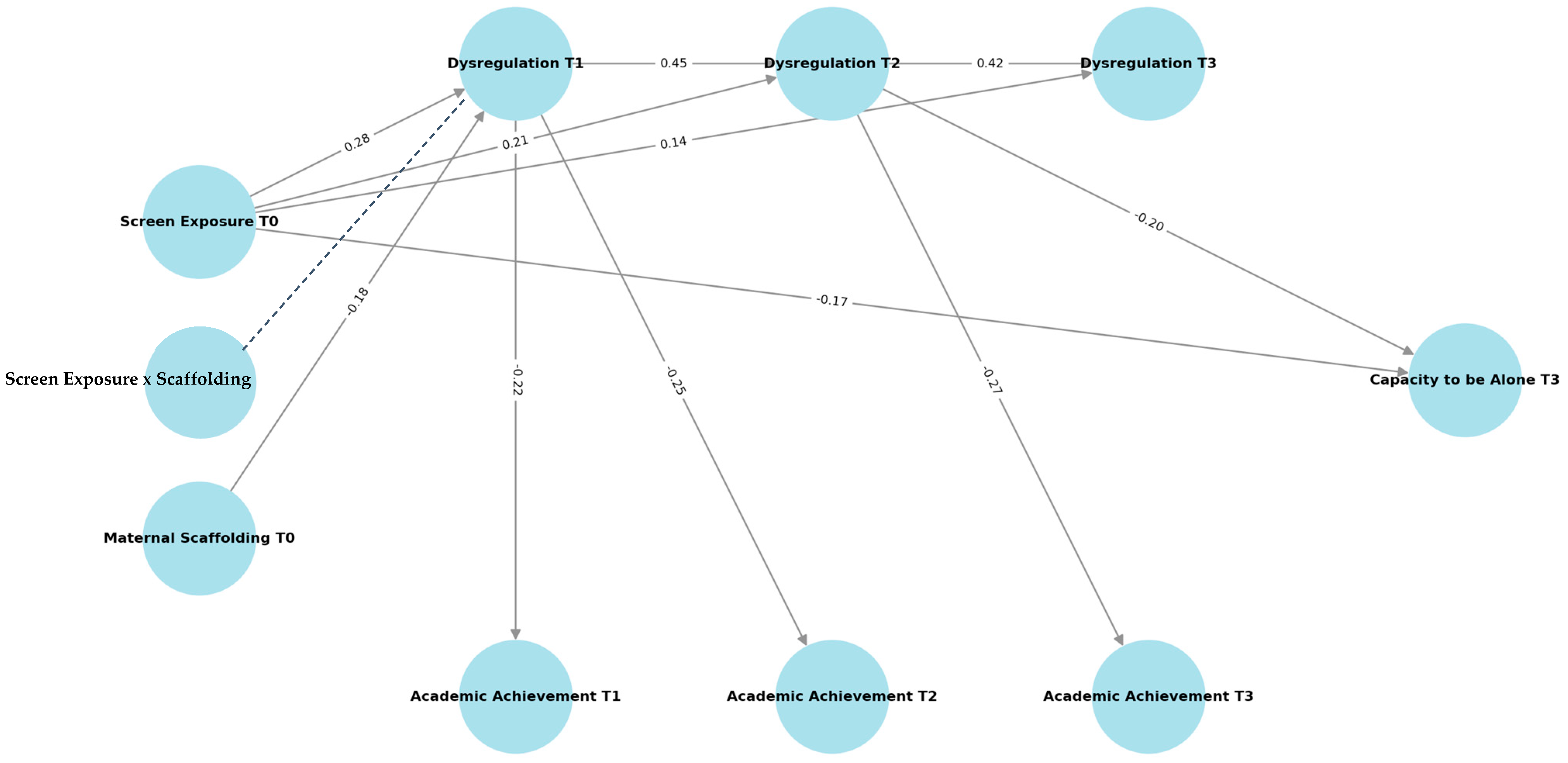 Table 3 presents the results of the path analyses, including direct, indirect, and interaction effects. As shown, early screen exposure significantly predicted increases in dysregulation across time points, with subsequent indirect effects on academic achievement and capacity to be alone. In addition, maternal scaffolding moderated the association between early screen exposure and dysregulation at T1.