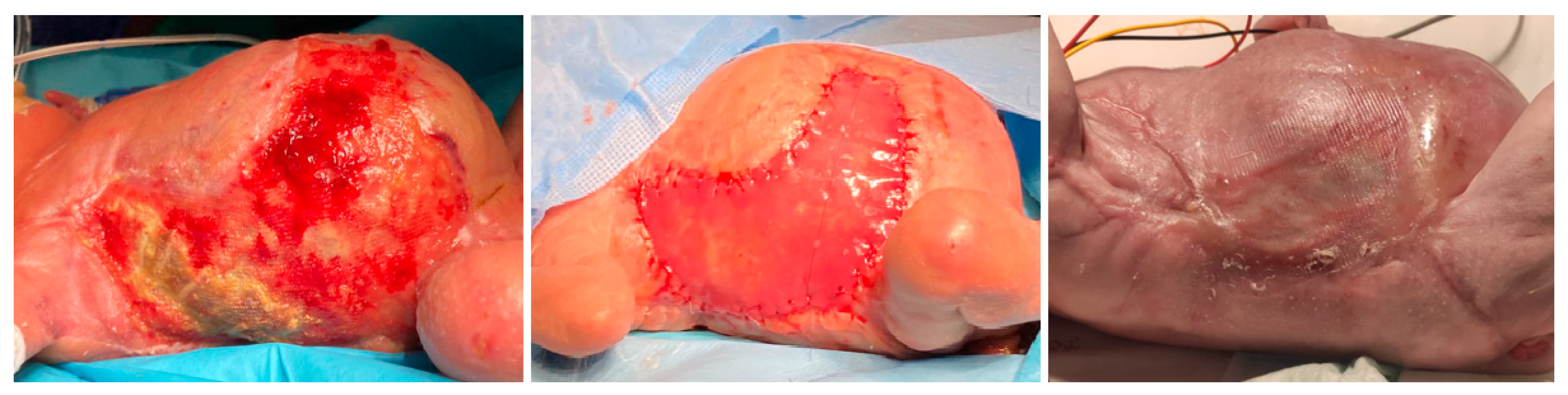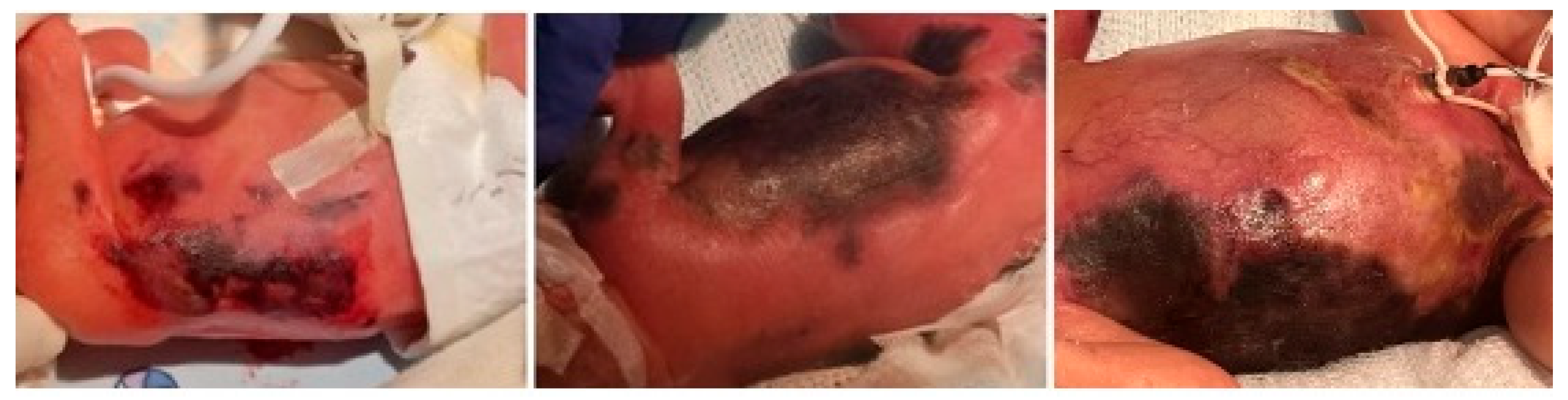 Following a multidisciplinary evaluation, the patient was diagnosed with neonatal purpura fulminans. Empiric broad-spectrum antimicrobial therapy with meropenem, vancomycin, and amphotericin B was started after obtaining blood cultures and conducting a serum galactomannan assay, the latter of which returned negative. Adjunctive treatment included vitamin K, fresh frozen plasma, and low-molecular-weight heparin at a dose of 2 mg/kg. Despite these, the skin lesions progressed over the next 48 h, prompting escalation of antimicrobial therapy to include daptomycin and voriconazole. Daily topical wound care was performed by the nursing team. Initially, dressings were performed using Linitul, later transitioning to Microdacyn soaks, followed by drying and application of dressings. Topical fusidic acid was also used in ointment and cream form. Given the clinical situation, the patient required multiple transfusions of blood products and high-dose opioid sedoanalgesia, achieving adequate pain control.