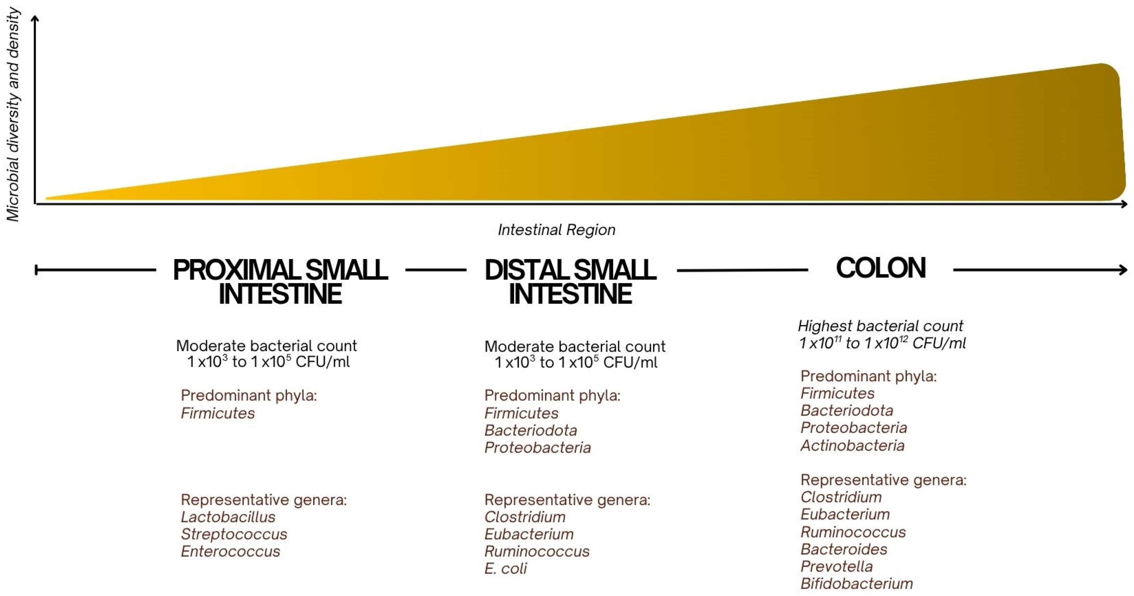 The small intestinal microbiota consists primarily of a variety of bacterial species working in homeostasis, with the composition of the microbiota shifting along the length of the intestine [3] (Figure 1). In the proximal small intestine, the microbiota is sparser and consists of Gram-positive bacteria, such as Lactobacillus and Streptococcus species, as well as some Enterococcus species [1]. These bacteria play a role in fermenting carbohydrates and preventing the overgrowth of harmful pathogens by maintaining an acidic pH. Lactobacillus species are known for producing lactic acid, which helps to lower the pH and create an environment hostile to pathogenic organisms [17].