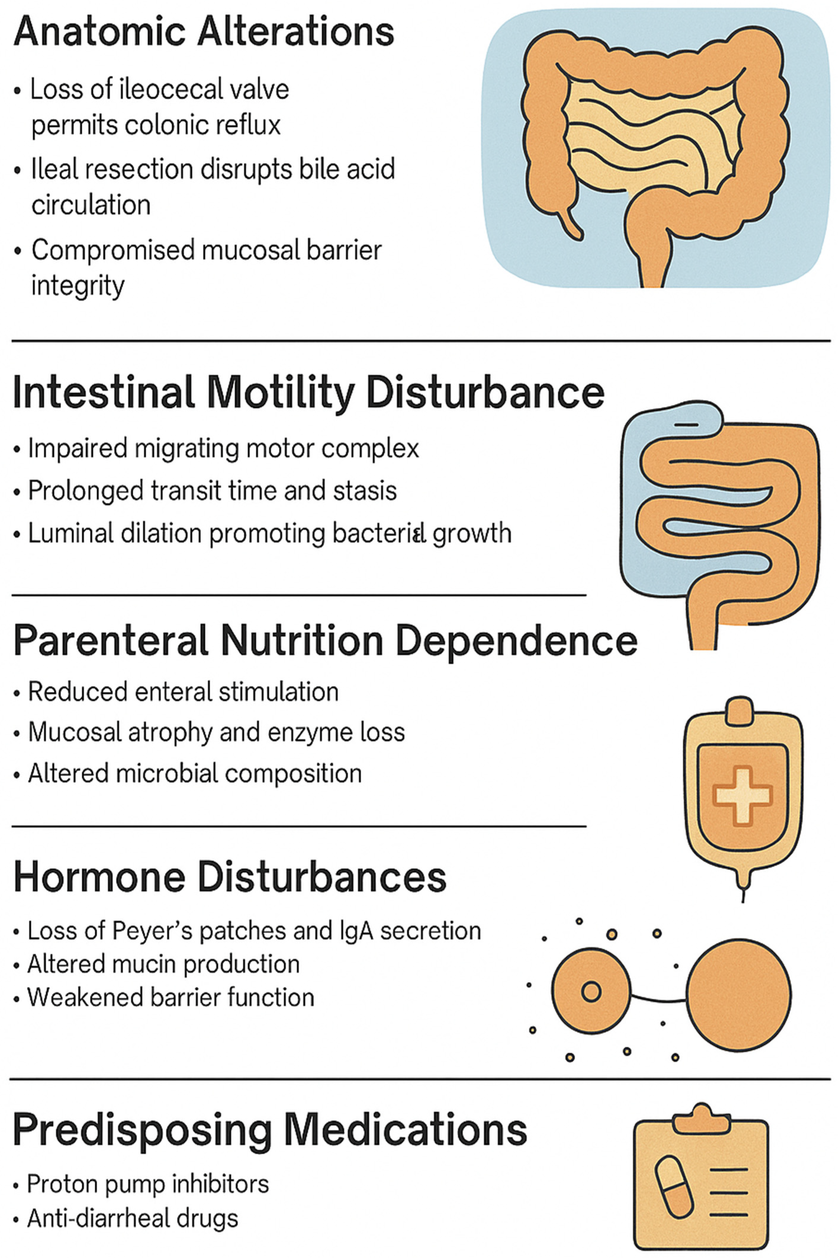 Pediatric SBS increases SIBO risk due to several risk factors, including anatomical abnormalities, motility dysfunction, reliance on parenteral nutrition, hormone disturbances, immune dysregulation, and predisposing medications (Table 1). These factors disrupt the gut microbiota, compromise mucosal barriers, and alter gastrointestinal motility, nutrient absorption, and immune function, thereby facilitating bacterial overgrowth (Figure 2).