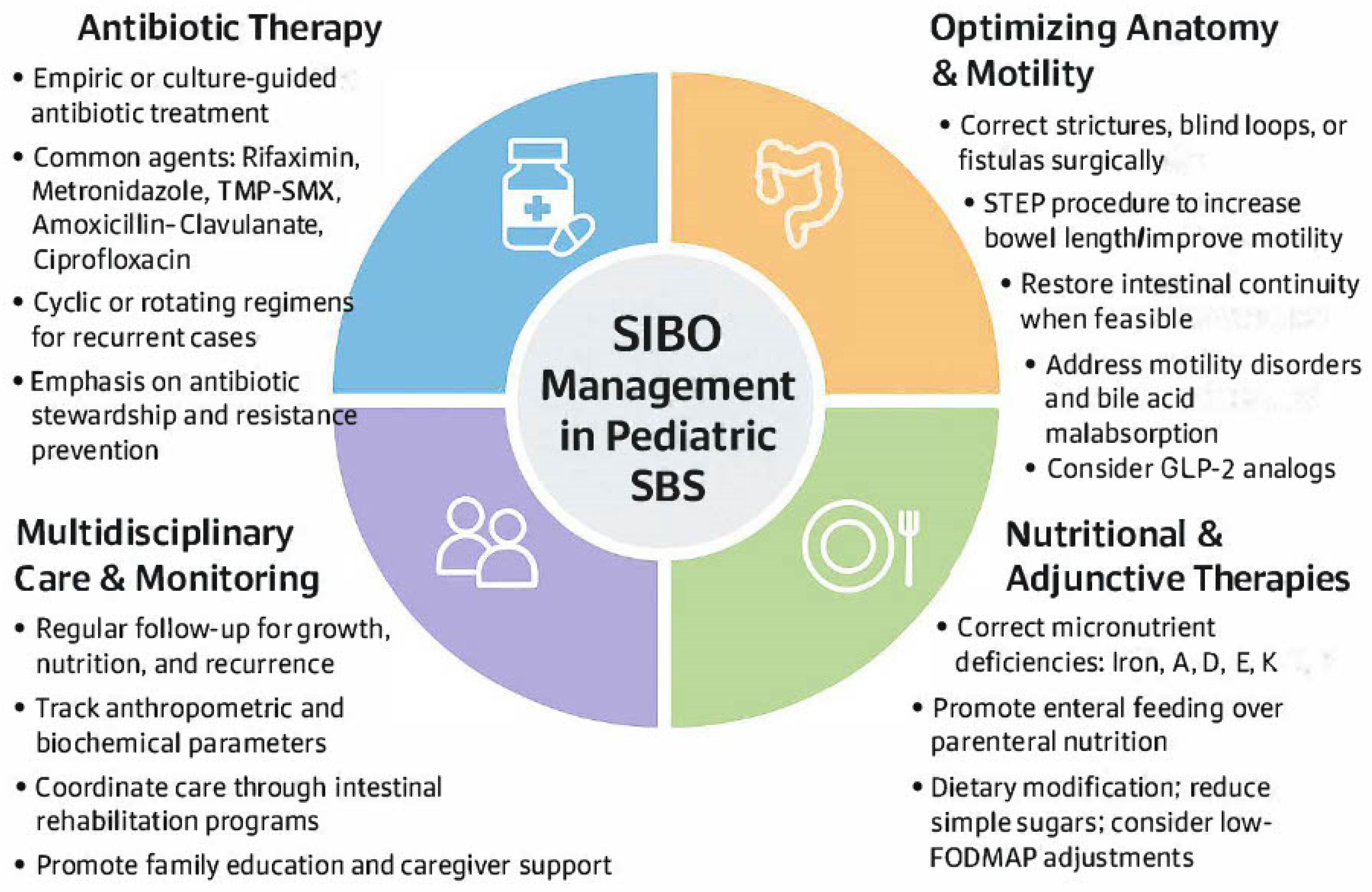 The treatment of SIBO in children with SBS presents a complex clinical challenge that necessitates a multifaceted and individualized approach. Because SIBO is not a primary disease but rather a secondary manifestation of underlying anatomical, motility-related, or immunological dysfunction, successful management hinges not only on antimicrobial therapy but also on addressing precipitating factors, supporting nutritional status, and preventing recurrence (Figure 5). Therapeutic strategies must be adapted to account for developmental physiology, antibiotic tolerability, and the inherent vulnerabilities of a surgically altered intestine.