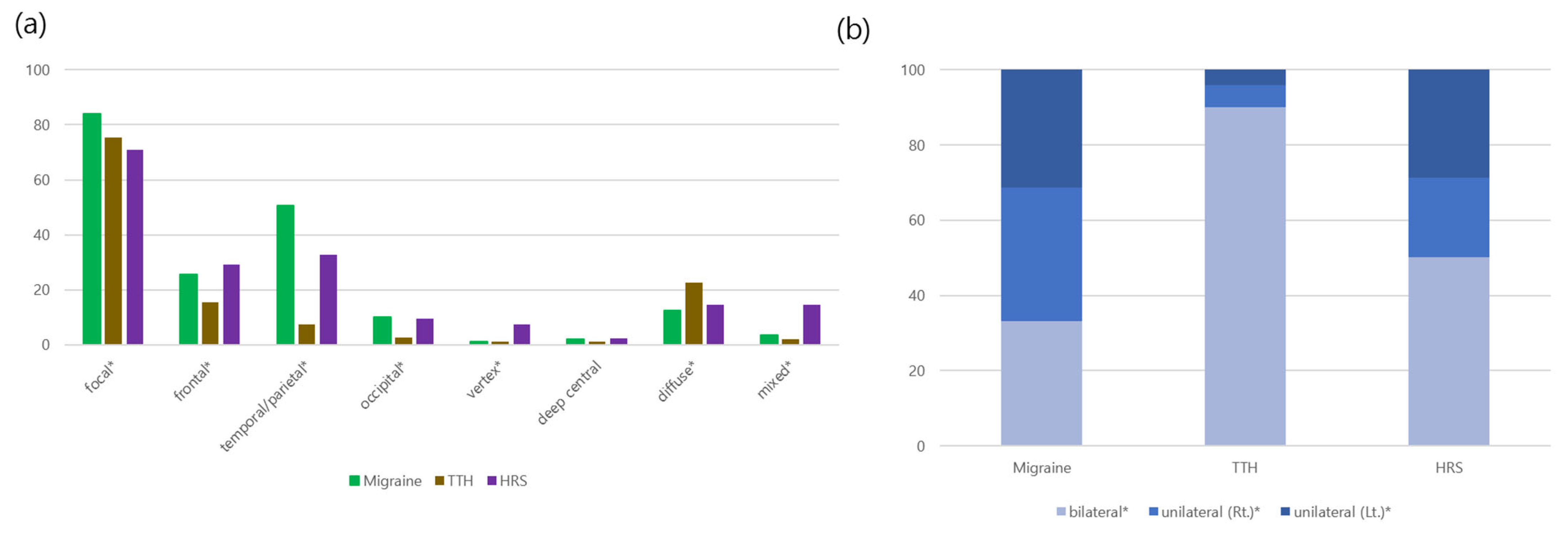 - Loder, E.; Weizenbaum, E.; Giddon, D. Migraine Pain Location and Measures of Healthcare Use and Distress: An Observational Study. Pain Res. Manag. 2018, 2018, 6157982. [Google Scholar] [CrossRef]