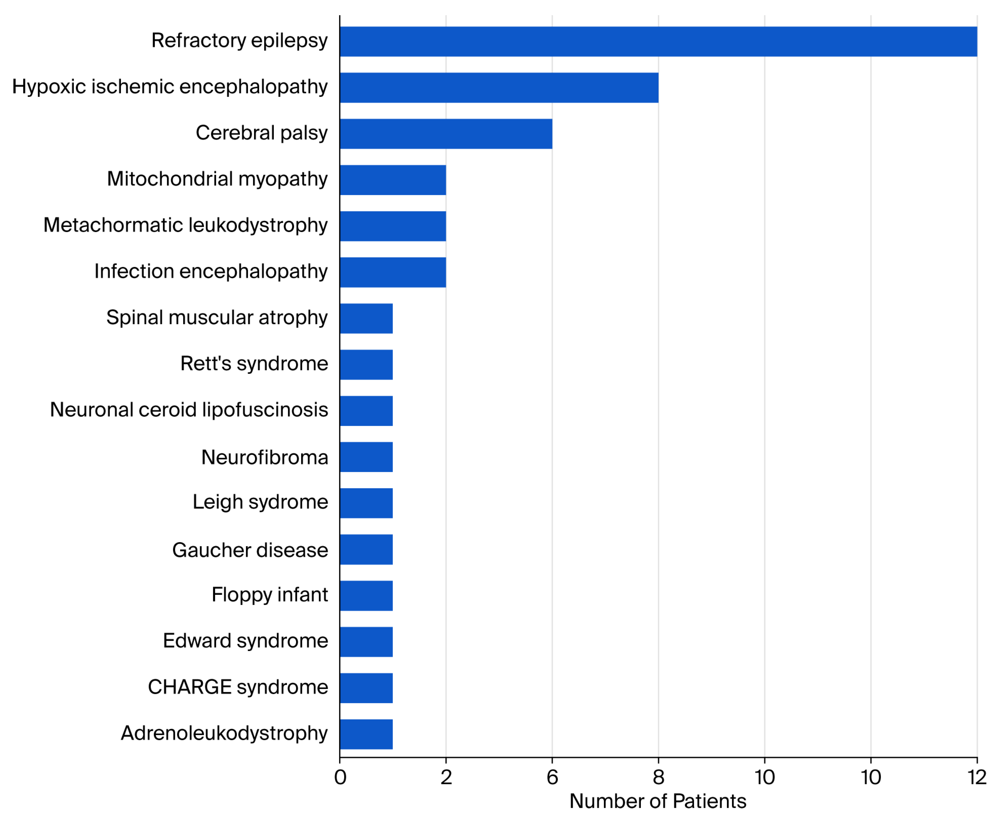 The etiology of the patients’ neurological conditions was heterogeneous, with refractory epilepsy being the most common, in 12 (31.6%) patients, followed by hypoxic–ischemic encephalopathy (HIE) in 6 (15.8%) patients and cerebral palsy (CP) in 4 (10.5%) patients. The remaining patients were diagnosed with various conditions (Figure 1).