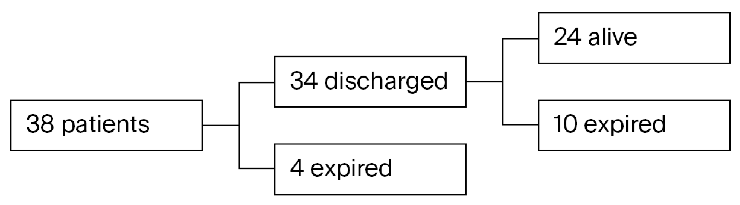 Among the 38 patients who underwent tracheostomy, 4 expired while undergoing observation and treatment at the hospital, whereas 34 were discharged in a satisfactory general condition. Following hospital discharge, 10 of these patients died during follow-up through regular outpatient treatment, whereas the remaining 24 are currently alive (Figure 2). None of the patients underwent decannulation, and all surviving patients continued to perform home ventilation through tracheostomy.
