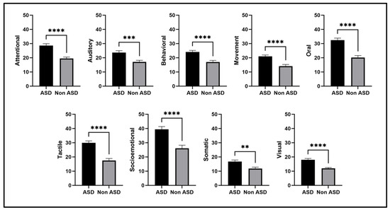 Sensory Hypersensitivity Profiles in ASD and Non-ASD Populations. Data are presented as mean ± SEM. Statistical comparisons were performed using the Mann–Whitney test (** p < 0.01, *** p < 0.001, **** p < 0.0001).