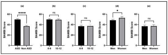 BAMBI (Brief Autism Mealtime Behaviour Inventory) scores in ASD and non-ASD populations stratified by age and sex. Results are presented for the entire sample (a), as well as for children with ASD (b,d) and non-ASD children (c,e). Data are presented as mean ± SEM, and comparisons were conducted using the Mann–Whitney test. * p < 0.05, **** p < 0.0001.