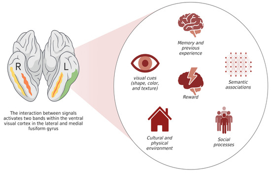 Modulatory Factors of Activation in the Ventral Visual Cortex. Among the modulatory factors are visual cues (shape, colour, texture), memory and prior experiences, the reward system, semantic associations, social processes, and the cultural and physical environment. Together, these elements contribute to establishing and refining food representations within the ventral visual cortex. As reported by Jain et al. (2023) [28], such representations are organised along gradual dimensions that reflect the prominence of food within the image (foreground vs. background), visual scale (close-up detail vs. scene context), and the presence or absence of social context. The spatial variability of these regions across individuals suggests that food representations are flexible and modulated by experience, cultural exposure, and reward history, rather than rigidly pre-specified. Figure created with BioRender®.