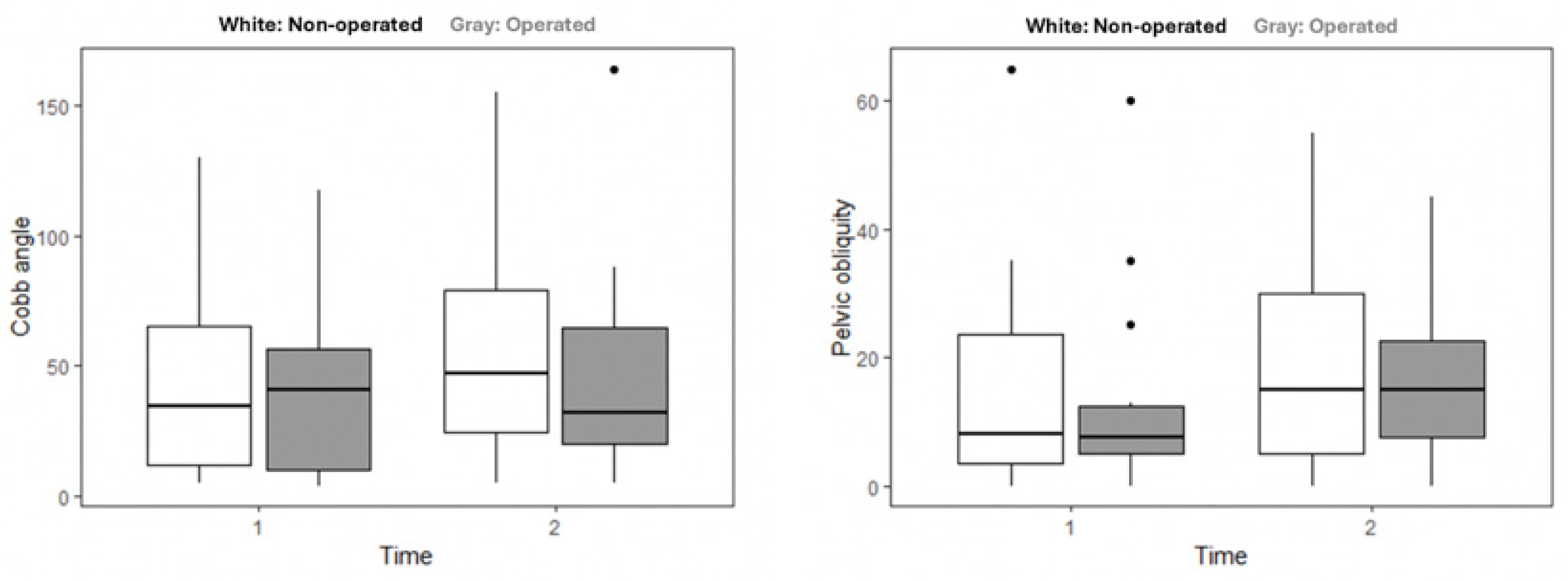 | Cobb angle at baseline (Md., IQR) | 34.50, 56 | 41, 51 | Wilcoxon rank sum test: p = 0.79 |