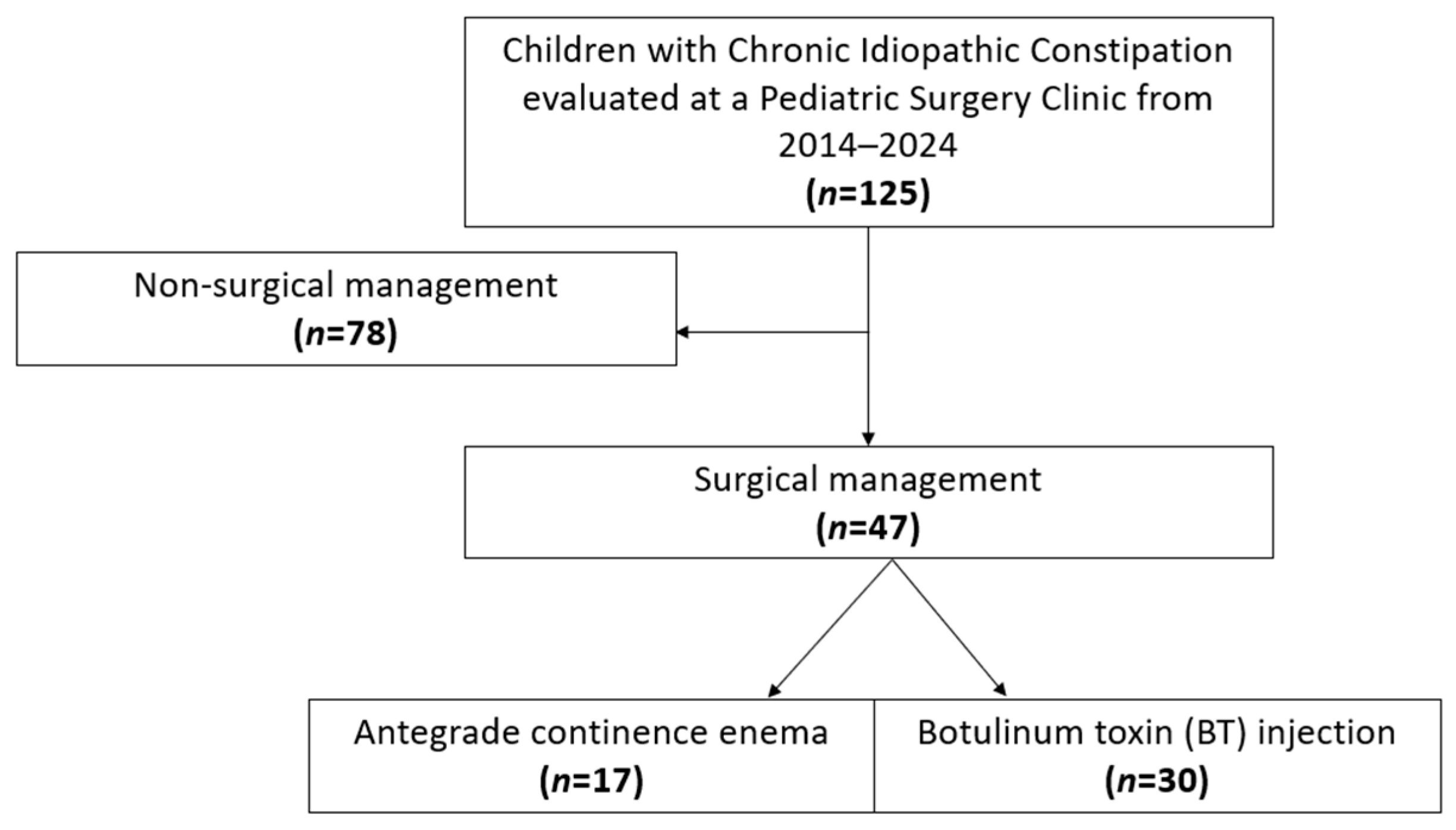 Chicago/Turabian StyleObidike, Prisca C., Trevor C. Jones, Chioma Moneme, Alexander Bills, Zoë Hemmer, Alison Jung, Lillian Wu, and Lily S. Cheng. 2025. "Antegrade Continence Enema vs. Botulinum Toxin in Pediatric Chronic Idiopathic Constipation: A 10-Year Retrospective Study at a Single Center" Children 12, no. 11: 1565. https://doi.org/10.3390/children12111565