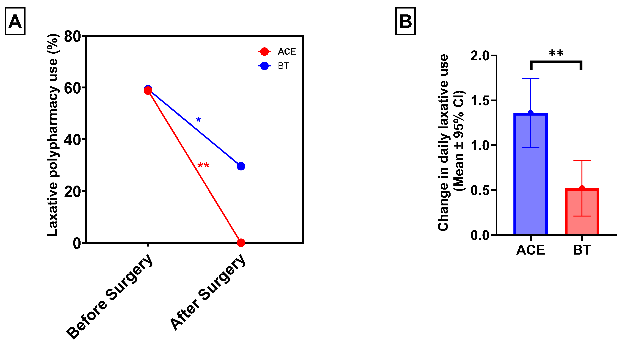- ACE recipients had a greater reduction in oral laxative use, while BT was associated with fewer complications and healthcare utilization visits at 1 year postoperatively.