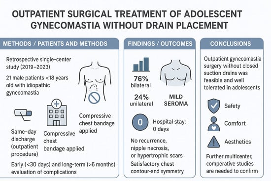 Chicago/Turabian StyleDelgado-Miguel, Carlos, Ennio Fuentes, Pablo Aguado, and Ricardo Díez. 2025. "Gynecomastia Outpatient Surgical Treatment in Children Without Closed-Suction Drain Placement: Is It Safe and Effective?" Children 12, no. 11: 1571. https://doi.org/10.3390/children12111571