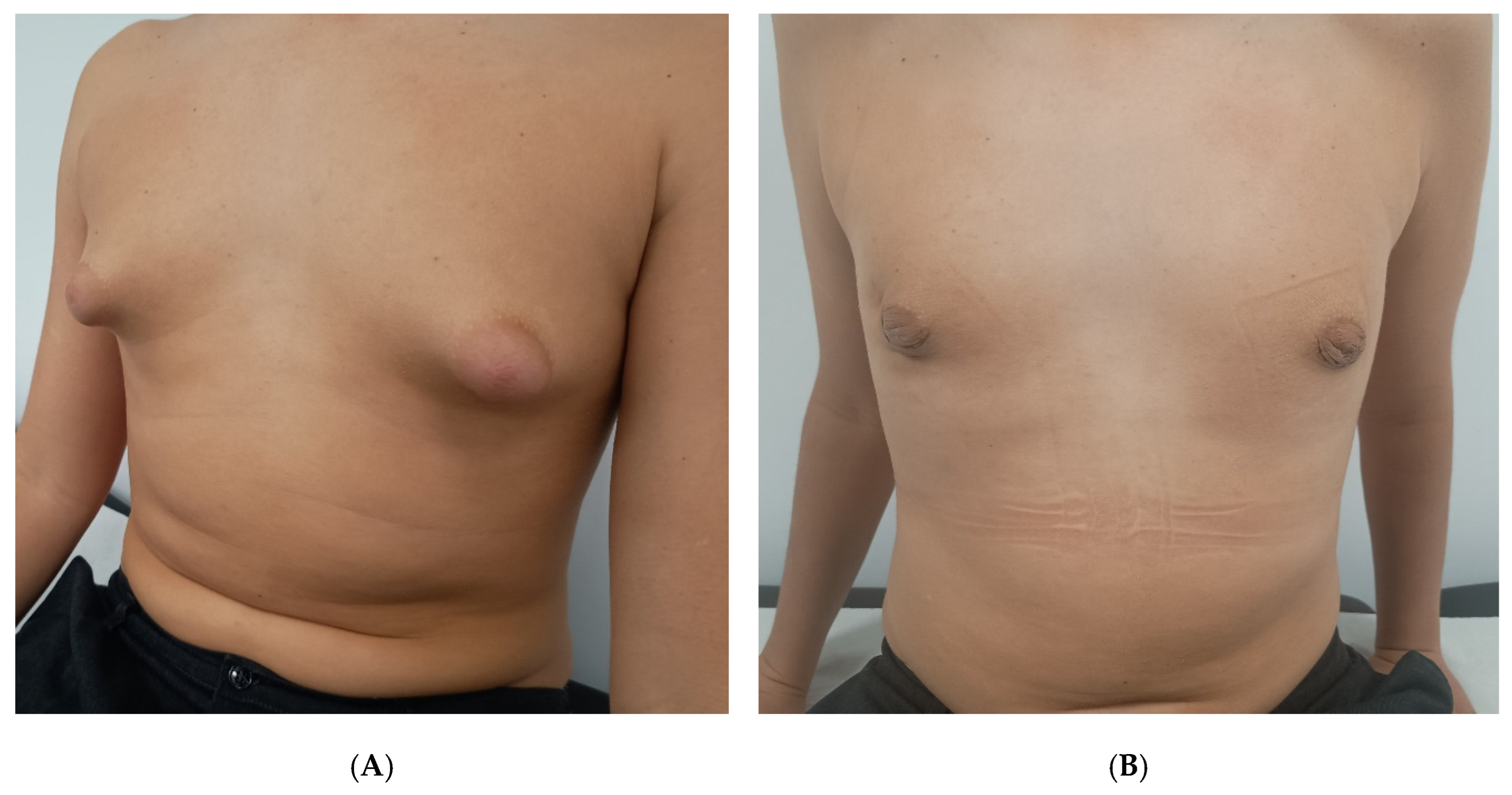 - Choi, B.S.; Lee, S.R.; Byun, G.Y.; Hwang, S.B.; Koo, B.H. The Characteristics and Short-Term Surgical Outcomes of Adolescent Gynecomastia. Aesthetic Plast. Surg. 2017, 41, 1011–1021. [Google Scholar] [CrossRef] [PubMed]