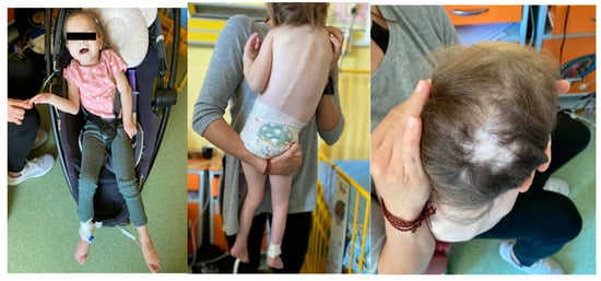 The 7-year-old female patient with Patau syndrome hospitalized due to pneumonia at Chair and Clinical Department of Pediatrics, Hospital No. 2 Bytom, School of Health Sciences, Medical University of Silesia in Katowice, Poland. Notable findings include failure to thrive, spinal deformity and aplasia cutis.