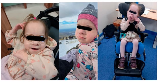 Despite the severity of the case, the patient, who is now 8 years old, receives a comprehensive, multidisciplinary approach, which likely contributes to her continued survival. The girl attends regular follow-ups with cardiologist, pulmonologist, audiologist, ophthalmologist, otolaryngologist, and gastroenterologist due to her underlying condition. Pharmacological treatment, medical adjustments and various therapies, including physiotherapy, rehabilitation that includes sensory sessions, speech and occupational therapies, have a positive impact on the girl’s daily life. The patient attends a primary school with specialist support that fosters her physical and sensory development and promotes progress in communication. Although the patient remains fully dependent for all mobility and self-care needs, she shows slow but constant improvement in her movement abilities. She can roll and reach to both sides, play with toys positioned above her chest, lift her head and arms when motivated and briefly maintain unsupported head control when held against gravity. She can sit with support and benefits from daily use of a standing frame. The patient accompanies her family’s mountain expeditions (Figure 3). The girl responds to speech with smiles and laughs, she enjoys watching her brothers play and cries when she wants to be cuddled; however, she has no significant speech development and has severe cognitive disabilities. Despite the numerous obstacles she faces, the patient’s journey illustrates the growth and development with the support of an interdisciplinary care team. It highlights the critical role of personalized care and early intervention.