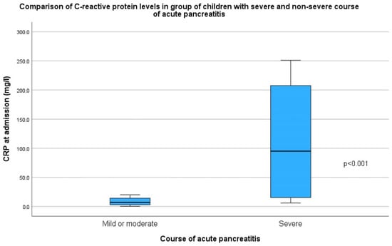 - Walker, H.; Melling, J.; Jones, M.; Melling, C. C-reactive protein accurately predicts severity of acute pancreatitis in children. J. Pediatr. Surg. 2022, 57, 759–764. [Google Scholar] [CrossRef]